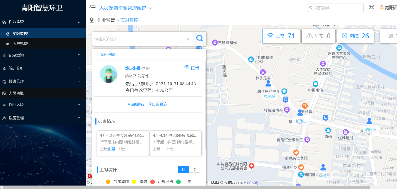 智慧環(huán)境平臺可將所有環(huán)衛(wèi)相關(guān)人員和設(shè)備納入監(jiān)管之中,并且提供歷史數(shù)據(jù)查詢、人員臺賬等功能。