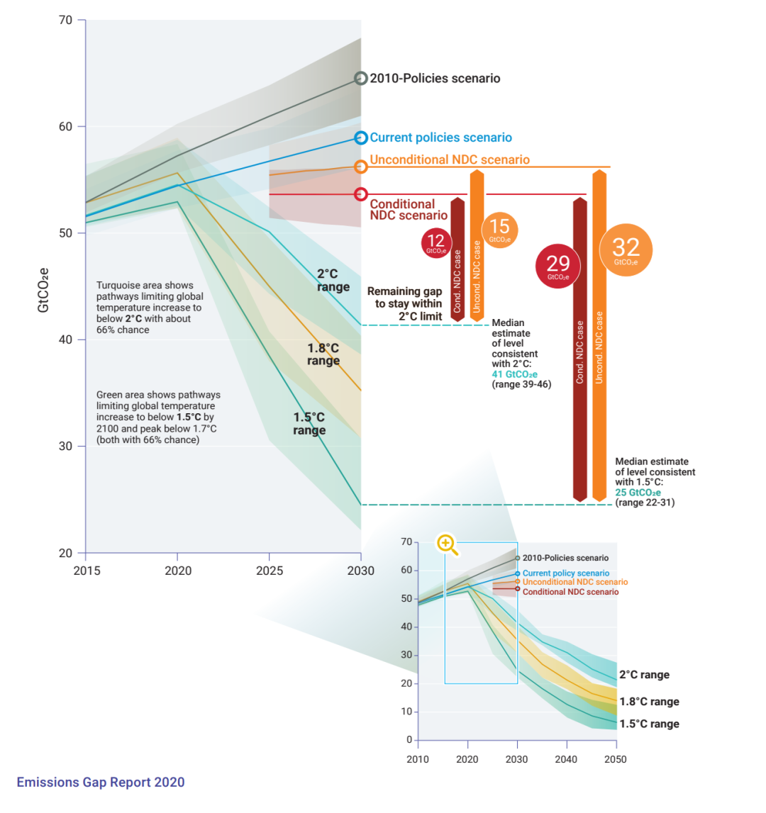 NDCs與預期溫控目標的差距 來源:Emissions Gap Report 2020
