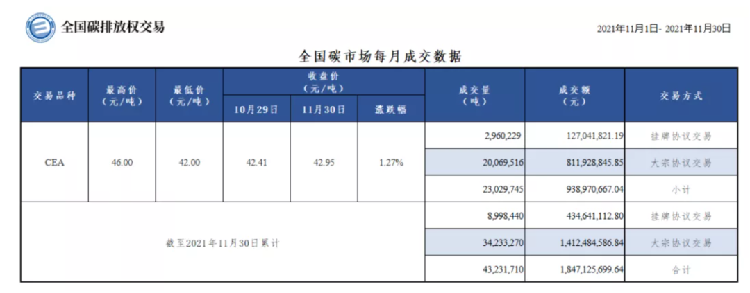 2021年7月全國碳市場在電力行業(yè)先行啟動,截至11月,全國碳市場碳排放配額(CEA)累計成交量4323萬噸,碳價約42-46元/噸,累計成交額18.47億元。