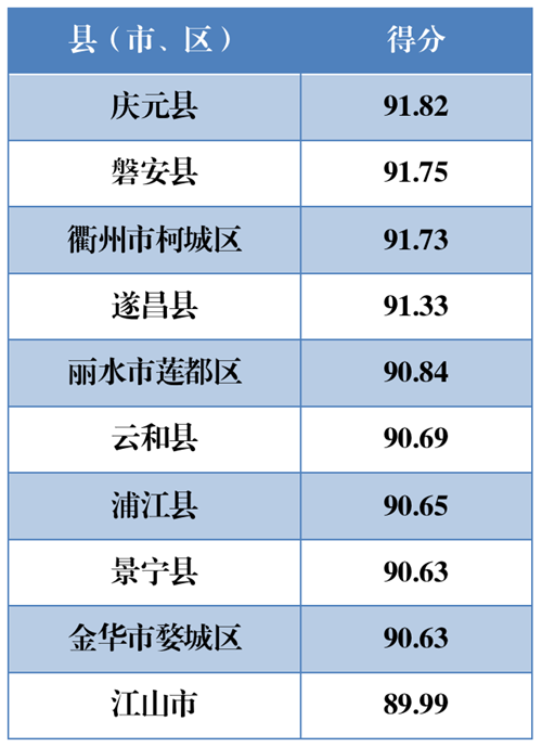 設(shè)區(qū)市比學(xué)趕超、保先爭先,呈現(xiàn)齊頭并進(jìn)態(tài)勢,地區(qū)差異不斷縮小??偟梅峙琶叭坏姆謩e是衢州市、麗水市和金華市,區(qū)域之間最高與最低相差6.42,較去年收窄0.49。