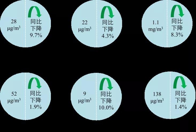 1-11月,全國339個(gè)地級(jí)及以上城市平均優(yōu)良天數(shù)比例為87.6%,同比下降0.3個(gè)百分點(diǎn);PM2.5平均濃度為28微克/立方米,同比下降9.7%;PM10平均濃度為52微克/立方米,同比下降1.9%;O3平均濃度為138微克/立方米,同比下降1.4%;SO2平均濃度為9微克/立方米,同比下降10.0%;NO2平均濃度為22微克/立方米,同比下降4.3%;CO平均濃度為1.1毫克/立方米,同比下降8.3%。