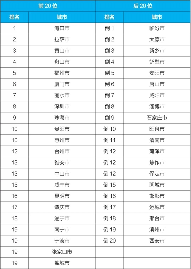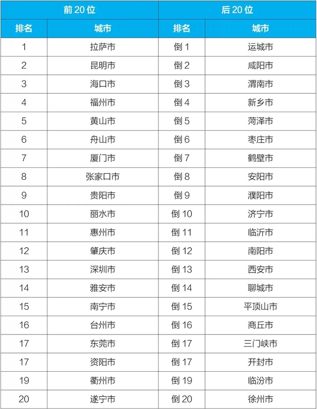 11月,168個(gè)重點(diǎn)城市中,拉薩、昆明和??诘?0個(gè)城市空氣質(zhì)量相對(duì)較好(從第1名至第20名),運(yùn)城、咸陽、渭南等20個(gè)城市空氣質(zhì)量相對(duì)較差(從倒數(shù)第1名至倒數(shù)第20名),見附表3。