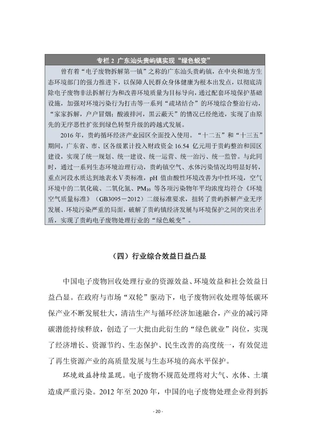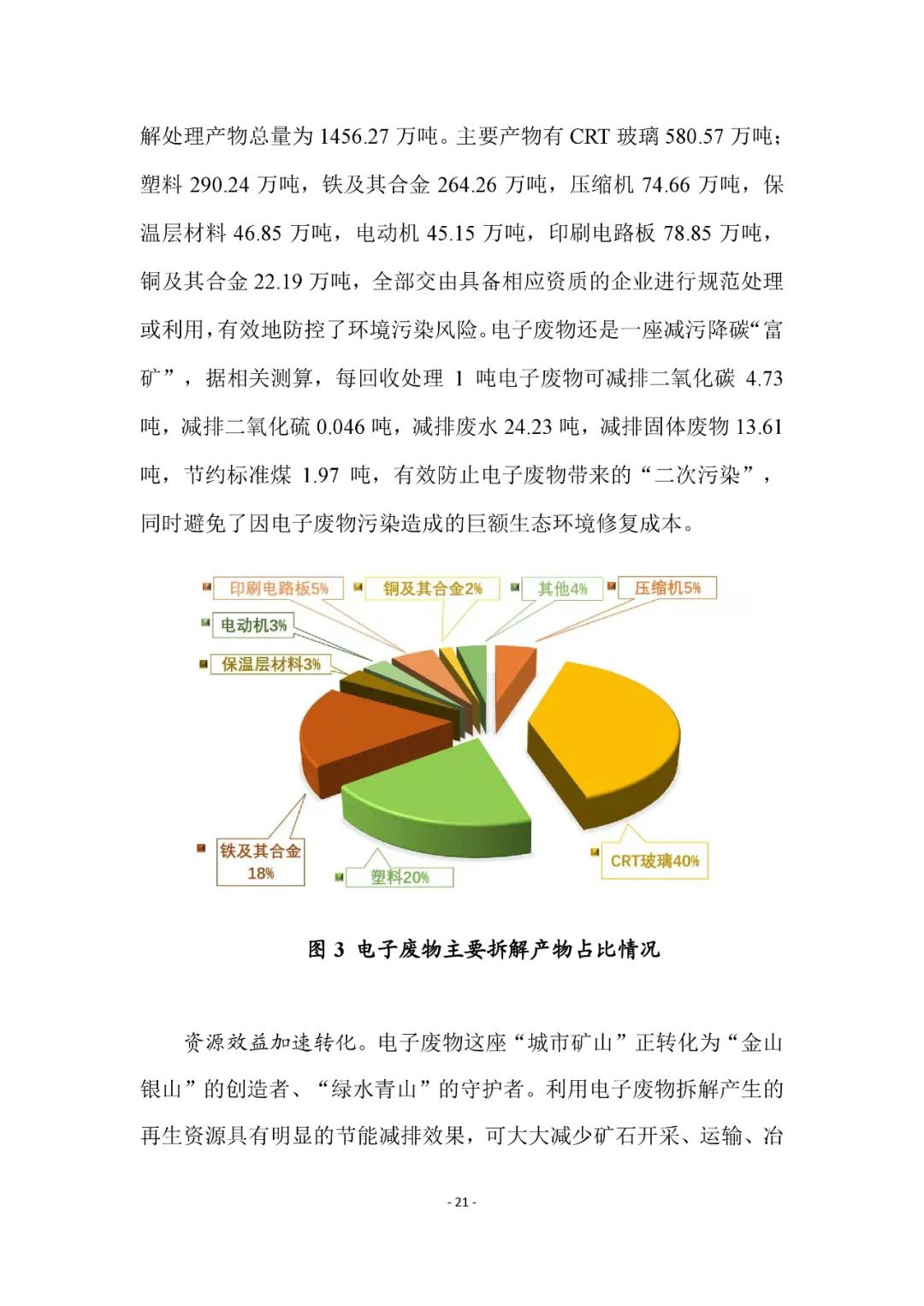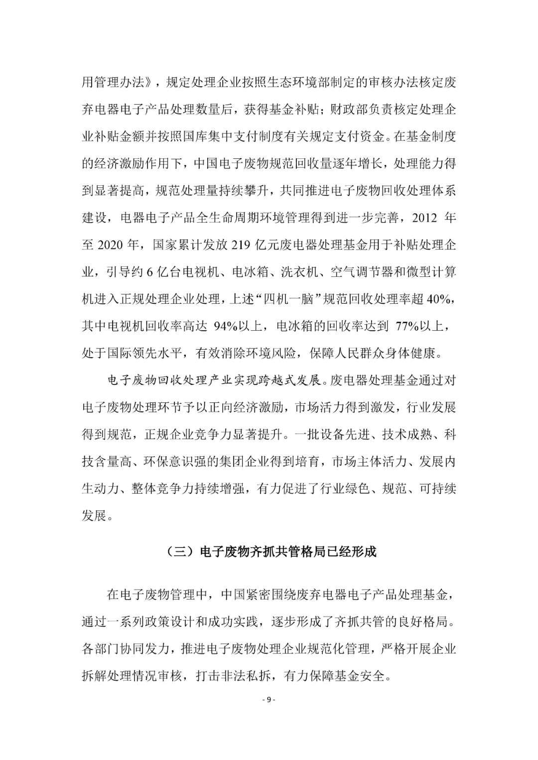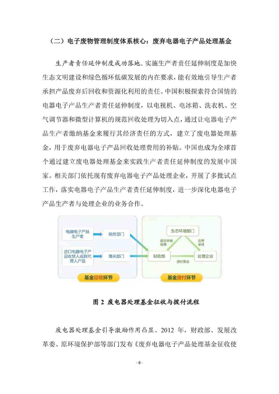 12月23日,生態(tài)環(huán)境部固體廢物與化學品管理技術中心發(fā)布《中國電子廢物環(huán)境綜合管理(2012-2021)》報告。報告從四大部分10個方面對近10年電子廢物行業(yè)發(fā)展做了系統(tǒng)闡述。近年來,中國的固體廢物污染防治的法規(guī)制度體系日臻完善,固體廢物源頭減量和資源化利用持續(xù)推進,固體廢物治理體系和治理能力得到顯著提升,為建設生態(tài)文明和美麗中國提供了堅強保障,也為其他國家和地區(qū)提供了中國經驗。為全面介紹中國電子廢物環(huán)境綜合管理理念和實踐,增進國際社會對中國電子廢物環(huán)境管理的了解,特發(fā)布本報告。(報告原文請點擊文末“閱讀原文”下載)一、堅定走生態(tài)優(yōu)先綠色低碳發(fā)展道路中國的電子廢物環(huán)境管理以全面促進資源節(jié)約集約利用為目標,全方位構建電子廢物減量化、資源化、無害化體系,切實解決老百姓身邊突出的電子廢物污染問題,積極適應新形勢新要求,扎實做好與“碳達峰、碳中和”等各項工作的對接融合,促進減污降碳協(xié)同增效,加快推動生態(tài)文明建設再上新臺階、取得新成效。二、建成以廢棄電器電子產品處理基金為核心的電子廢物環(huán)境綜合管理體系電子廢物管理是世界各國面臨的重大環(huán)境問題,中國立足國情實際,在借鑒國際實踐經驗的基礎上,形成了以廢棄電器電子產品處理基金為核心的生產者責任延伸制度,建成符合中國國情的電子廢物環(huán)境綜合管理體系,為促進資源全面節(jié)約和循環(huán)利用、保護生態(tài)環(huán)境、保障人體健康奠定了堅實基礎。(一)中國電子廢物管理制度框架日臻完善。《中華人民共和國固體廢物污染環(huán)境防治法》《中華人民共和國清潔生產促進法》《中華人民共和國循環(huán)經濟促進法》是中國電子廢物管理的法律基礎,特別是中國出臺《廢棄電器電子產品回收處理管理條例》,并發(fā)布《廢棄電器電子產品處理基金征收使用管理辦法》等配套政策文件,電子廢物環(huán)境管理體系和技術要求得到進一步完善。(二)廢棄電器電子產品處理基金成為電子廢物管理制度體系核心。中國積極探索符合國情的電器電子產品生產者責任延伸制度,通過讓電器電子產品生產者繳納基金的方式,建立了廢電器處理基金,用于廢棄電器電子產品回收處理費用的補貼,成為全球首個通過建立廢電器處理基金來實踐生產者責任延伸制度的發(fā)展中國家。2012年至2020年,中國累計發(fā)放219億元廢電器處理基金用于補貼處理企業(yè),引導約6億臺電視機、電冰箱、洗衣機、空氣調節(jié)器、微型計算機進入正規(guī)處理企業(yè),其中電視機回收率高達94%以上,電冰箱的回收率達到77%以上,處于國際領先水平,有效消除了環(huán)境風險,保障了人民群眾身體健康。在廢電器處理基金的激勵下,廢電器處理企業(yè)的發(fā)展內生動力和整體競爭力持續(xù)增強,中國的電子廢物回收處理產業(yè)實現了跨越式發(fā)展。(三)形成電子廢物齊抓共管工作格局。中國緊密圍繞廢棄電器電子產品處理基金制度,通過一系列政策設計和成功實踐,逐步形成了電子廢物齊抓共管的良好格局。各相關部門協(xié)同發(fā)力,管理范圍貫穿電器電子產品生產、流通、回收處理和循環(huán)利用的全生命周期。嚴格開展企業(yè)拆解處理情況審核,打擊非法拆解,有力保障了基金安全。三、促進電子廢物處理處置行業(yè)高質量發(fā)展中國的電子廢物處理企業(yè)規(guī)范發(fā)展與環(huán)境質量改善同步推進,顯著降低了有關生態(tài)環(huán)境風險和職業(yè)健康風險,電子廢物規(guī)范回收處理率、技術研發(fā)、產業(yè)鏈體量、環(huán)境保護要求等方面加快與國際一流水平接軌,相關從業(yè)人員和行業(yè)管理者自信心不斷增強,電子廢物處理行業(yè)邁入新的發(fā)展階段。(一)處理企業(yè)主體活力充分激發(fā)釋放。在廢電器處理基金等支持政策的激勵下,中國電子廢物產業(yè)發(fā)展活力競相迸發(fā),產業(yè)規(guī)模優(yōu)勢逐漸顯現。正規(guī)處理企業(yè)處理能力由2012年的0.46億臺/年增長至2020年的1.64億臺/年,電子廢物處理企業(yè)年實際處理量由2012年的1010萬臺增長至2020年的8498萬臺。中國的電子廢物處理企業(yè)嚴格執(zhí)行國家“以人為本,加強職業(yè)健康安全保障,改善勞動條件”的規(guī)定,從業(yè)人員職業(yè)健康和生命安全得到切實保障。(二)處理技術水平顯著增強提升。中國的電子廢物處理行業(yè)自動化、機械化、智能化、綠色化水平不斷提高,產業(yè)鏈得到延伸,價值鏈獲得提升,企業(yè)的環(huán)境污染防治措施落實落地,拆解處理工藝流程標準規(guī)范,拆解處理技術不斷革新,科技賦能應用成效顯著,引領了整個再生資源產業(yè)的高質量發(fā)展。(三)非法拆解活動得到有效遏制。有關執(zhí)法部門通過打好非法拆解整治“組合拳”,電子廢物非法拆解的情況得到遏制,促進了電子廢物回收處理行業(yè)健康發(fā)展。曾有著“電子廢物拆解第一鎮(zhèn)”之稱的廣東汕頭貴嶼鎮(zhèn),通過一系列“疏堵結合”的環(huán)境綜合整治行動,“家家拆解,戶戶冒煙;酸液排河,黑云蔽天”的情況已經絕跡,當地大氣、水體污染情況均明顯好轉,實現了由原先的無序惡性擴張