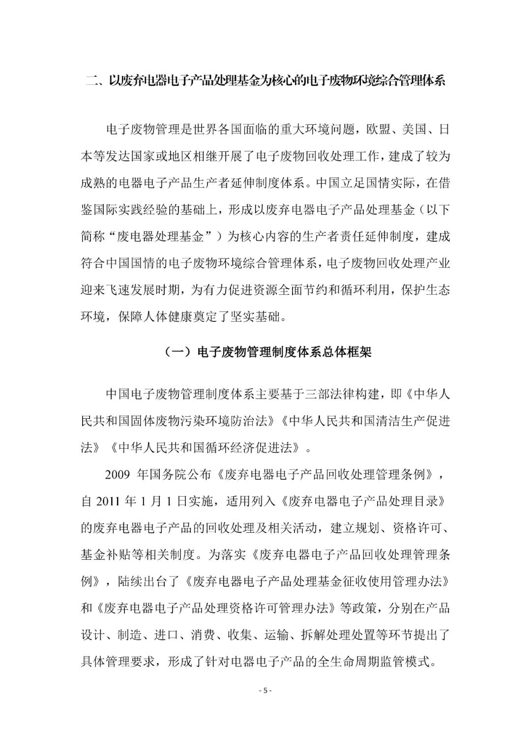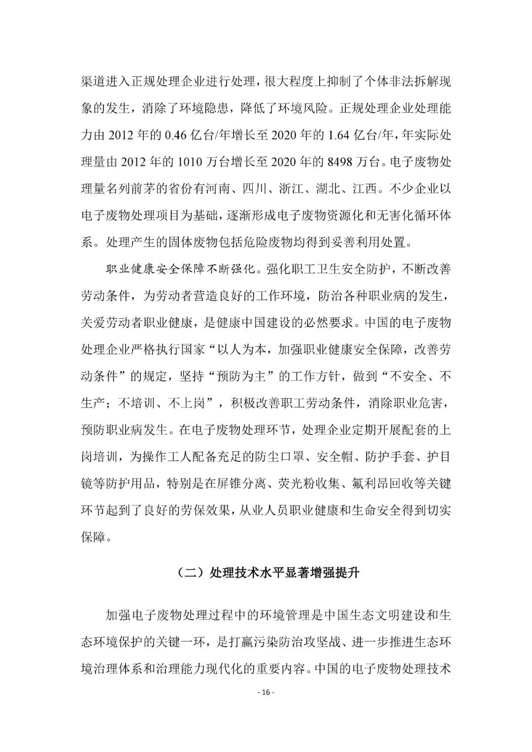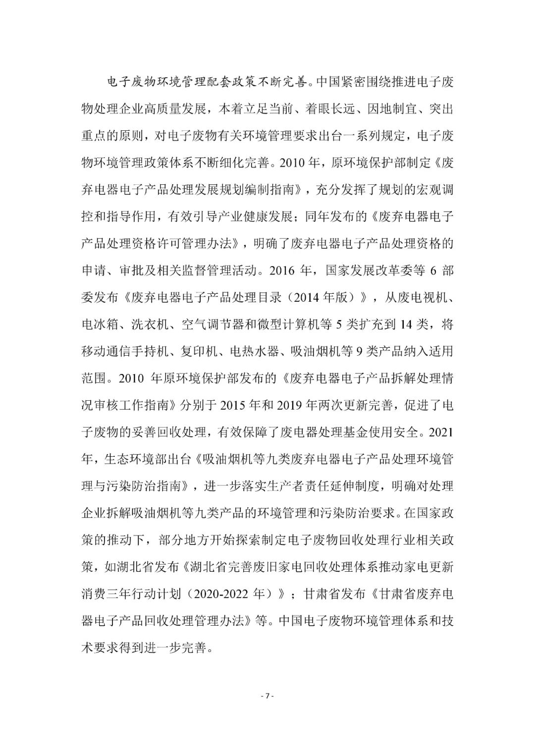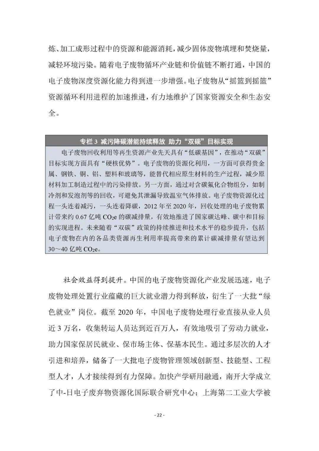 12月23日,生態(tài)環(huán)境部固體廢物與化學品管理技術中心發(fā)布《中國電子廢物環(huán)境綜合管理(2012-2021)》報告。報告從四大部分10個方面對近10年電子廢物行業(yè)發(fā)展做了系統(tǒng)闡述。近年來,中國的固體廢物污染防治的法規(guī)制度體系日臻完善,固體廢物源頭減量和資源化利用持續(xù)推進,固體廢物治理體系和治理能力得到顯著提升,為建設生態(tài)文明和美麗中國提供了堅強保障,也為其他國家和地區(qū)提供了中國經驗。為全面介紹中國電子廢物環(huán)境綜合管理理念和實踐,增進國際社會對中國電子廢物環(huán)境管理的了解,特發(fā)布本報告。(報告原文請點擊文末“閱讀原文”下載)一、堅定走生態(tài)優(yōu)先綠色低碳發(fā)展道路中國的電子廢物環(huán)境管理以全面促進資源節(jié)約集約利用為目標,全方位構建電子廢物減量化、資源化、無害化體系,切實解決老百姓身邊突出的電子廢物污染問題,積極適應新形勢新要求,扎實做好與“碳達峰、碳中和”等各項工作的對接融合,促進減污降碳協(xié)同增效,加快推動生態(tài)文明建設再上新臺階、取得新成效。二、建成以廢棄電器電子產品處理基金為核心的電子廢物環(huán)境綜合管理體系電子廢物管理是世界各國面臨的重大環(huán)境問題,中國立足國情實際,在借鑒國際實踐經驗的基礎上,形成了以廢棄電器電子產品處理基金為核心的生產者責任延伸制度,建成符合中國國情的電子廢物環(huán)境綜合管理體系,為促進資源全面節(jié)約和循環(huán)利用、保護生態(tài)環(huán)境、保障人體健康奠定了堅實基礎。(一)中國電子廢物管理制度框架日臻完善。《中華人民共和國固體廢物污染環(huán)境防治法》《中華人民共和國清潔生產促進法》《中華人民共和國循環(huán)經濟促進法》是中國電子廢物管理的法律基礎,特別是中國出臺《廢棄電器電子產品回收處理管理條例》,并發(fā)布《廢棄電器電子產品處理基金征收使用管理辦法》等配套政策文件,電子廢物環(huán)境管理體系和技術要求得到進一步完善。(二)廢棄電器電子產品處理基金成為電子廢物管理制度體系核心。中國積極探索符合國情的電器電子產品生產者責任延伸制度,通過讓電器電子產品生產者繳納基金的方式,建立了廢電器處理基金,用于廢棄電器電子產品回收處理費用的補貼,成為全球首個通過建立廢電器處理基金來實踐生產者責任延伸制度的發(fā)展中國家。2012年至2020年,中國累計發(fā)放219億元廢電器處理基金用于補貼處理企業(yè),引導約6億臺電視機、電冰箱、洗衣機、空氣調節(jié)器、微型計算機進入正規(guī)處理企業(yè),其中電視機回收率高達94%以上,電冰箱的回收率達到77%以上,處于國際領先水平,有效消除了環(huán)境風險,保障了人民群眾身體健康。在廢電器處理基金的激勵下,廢電器處理企業(yè)的發(fā)展內生動力和整體競爭力持續(xù)增強,中國的電子廢物回收處理產業(yè)實現了跨越式發(fā)展。(三)形成電子廢物齊抓共管工作格局。中國緊密圍繞廢棄電器電子產品處理基金制度,通過一系列政策設計和成功實踐,逐步形成了電子廢物齊抓共管的良好格局。各相關部門協(xié)同發(fā)力,管理范圍貫穿電器電子產品生產、流通、回收處理和循環(huán)利用的全生命周期。嚴格開展企業(yè)拆解處理情況審核,打擊非法拆解,有力保障了基金安全。三、促進電子廢物處理處置行業(yè)高質量發(fā)展中國的電子廢物處理企業(yè)規(guī)范發(fā)展與環(huán)境質量改善同步推進,顯著降低了有關生態(tài)環(huán)境風險和職業(yè)健康風險,電子廢物規(guī)范回收處理率、技術研發(fā)、產業(yè)鏈體量、環(huán)境保護要求等方面加快與國際一流水平接軌,相關從業(yè)人員和行業(yè)管理者自信心不斷增強,電子廢物處理行業(yè)邁入新的發(fā)展階段。(一)處理企業(yè)主體活力充分激發(fā)釋放。在廢電器處理基金等支持政策的激勵下,中國電子廢物產業(yè)發(fā)展活力競相迸發(fā),產業(yè)規(guī)模優(yōu)勢逐漸顯現。正規(guī)處理企業(yè)處理能力由2012年的0.46億臺/年增長至2020年的1.64億臺/年,電子廢物處理企業(yè)年實際處理量由2012年的1010萬臺增長至2020年的8498萬臺。中國的電子廢物處理企業(yè)嚴格執(zhí)行國家“以人為本,加強職業(yè)健康安全保障,改善勞動條件”的規(guī)定,從業(yè)人員職業(yè)健康和生命安全得到切實保障。(二)處理技術水平顯著增強提升。中國的電子廢物處理行業(yè)自動化、機械化、智能化、綠色化水平不斷提高,產業(yè)鏈得到延伸,價值鏈獲得提升,企業(yè)的環(huán)境污染防治措施落實落地,拆解處理工藝流程標準規(guī)范,拆解處理技術不斷革新,科技賦能應用成效顯著,引領了整個再生資源產業(yè)的高質量發(fā)展。(三)非法拆解活動得到有效遏制。有關執(zhí)法部門通過打好非法拆解整治“組合拳”,電子廢物非法拆解的情況得到遏制,促進了電子廢物回收處理行業(yè)健康發(fā)展。曾有著“電子廢物拆解第一鎮(zhèn)”之稱的廣東汕頭貴嶼鎮(zhèn),通過一系列“疏堵結合”的環(huán)境綜合整治行動,“家家拆解,戶戶冒煙;酸液排河,黑云蔽天”的情況已經絕跡,當地大氣、水體污染情況均明顯好轉,實現了由原先的無序惡性擴張