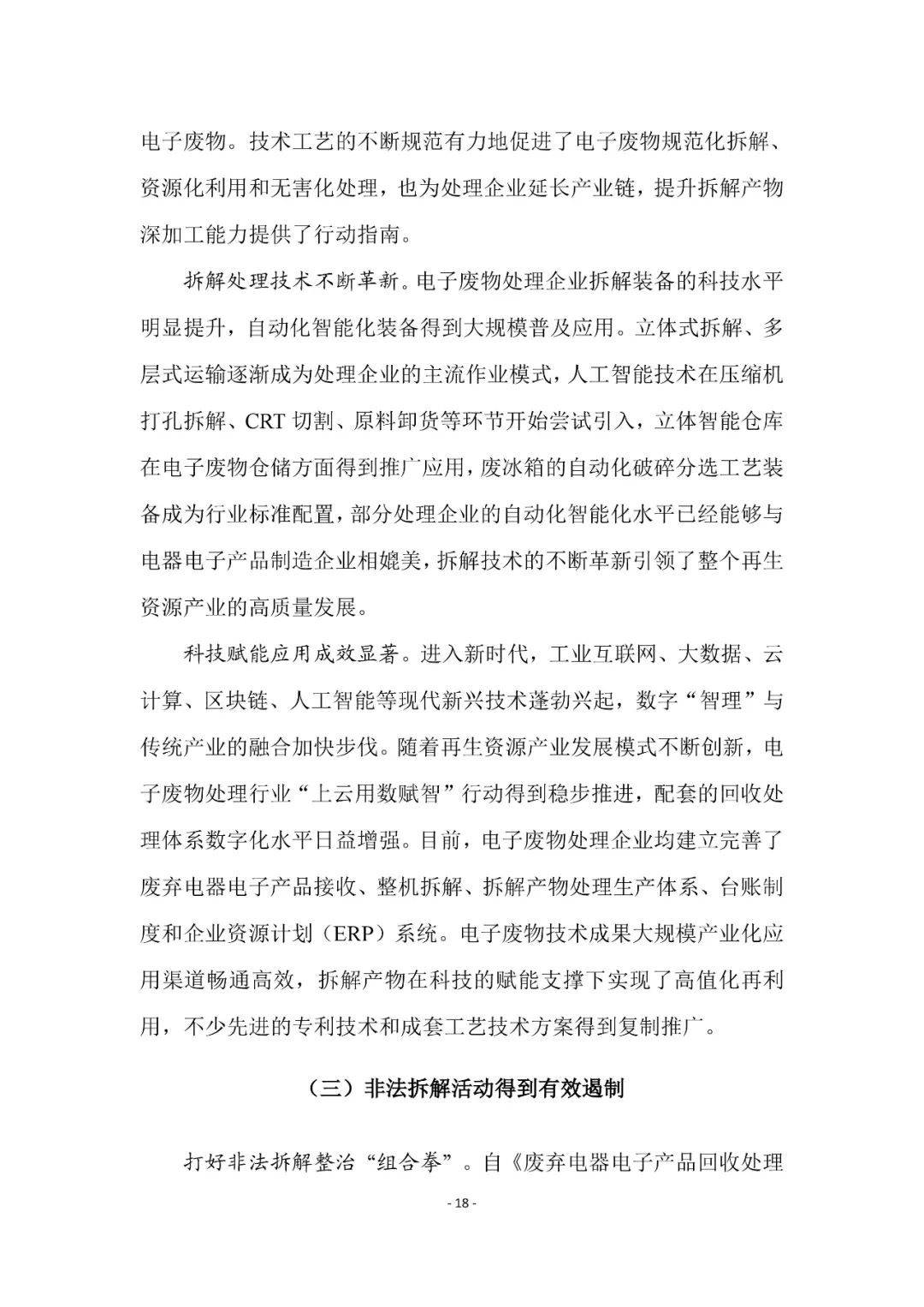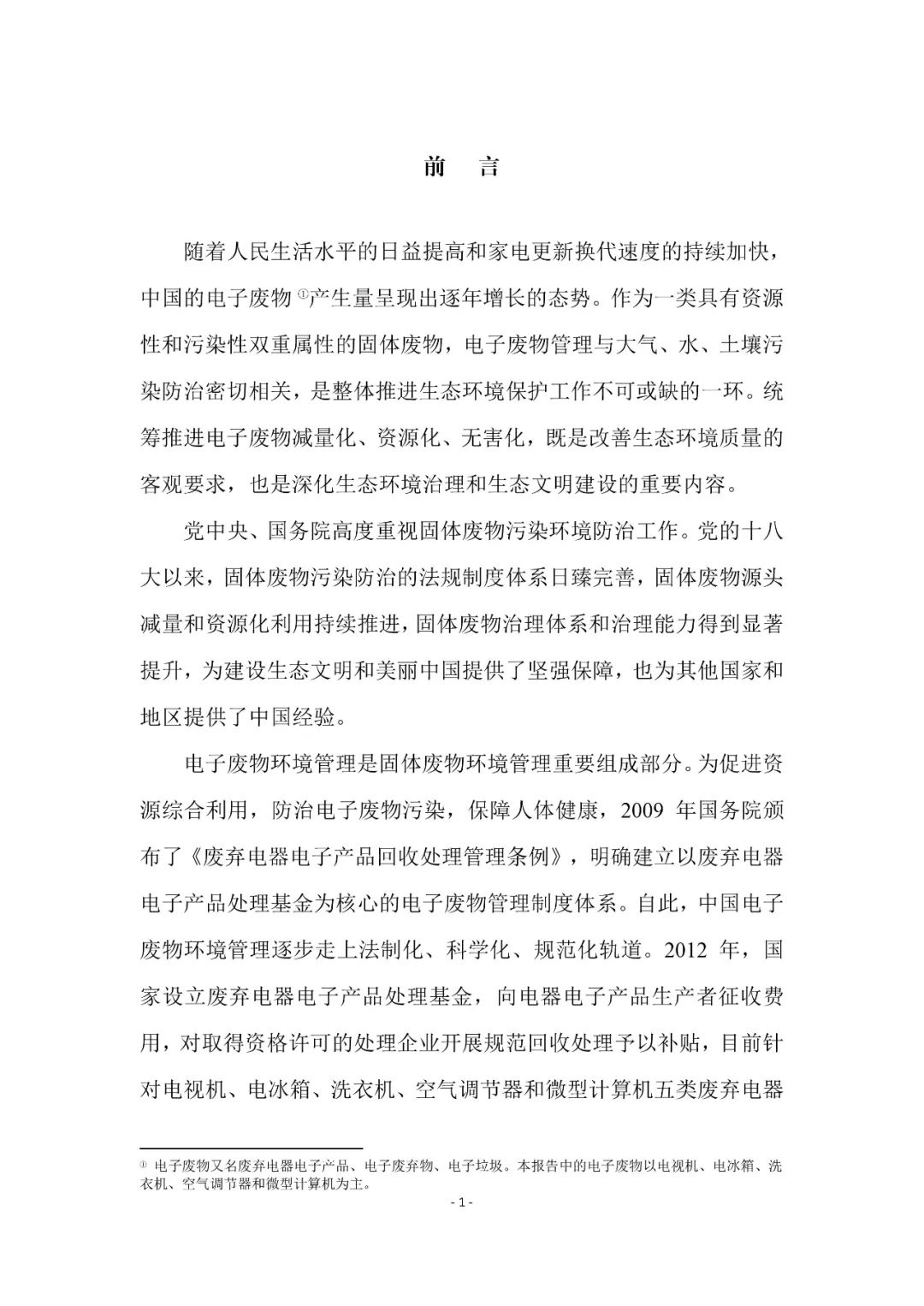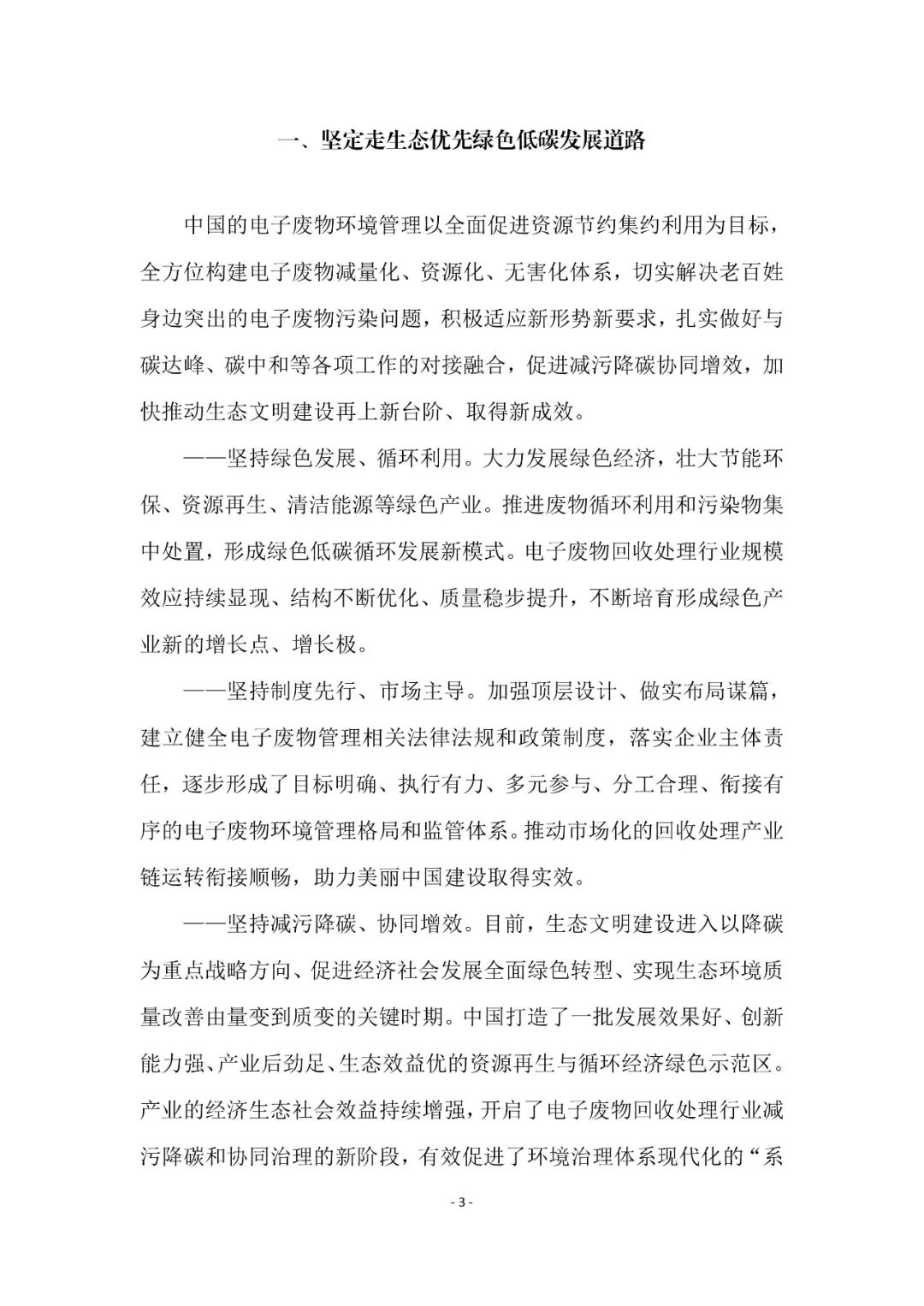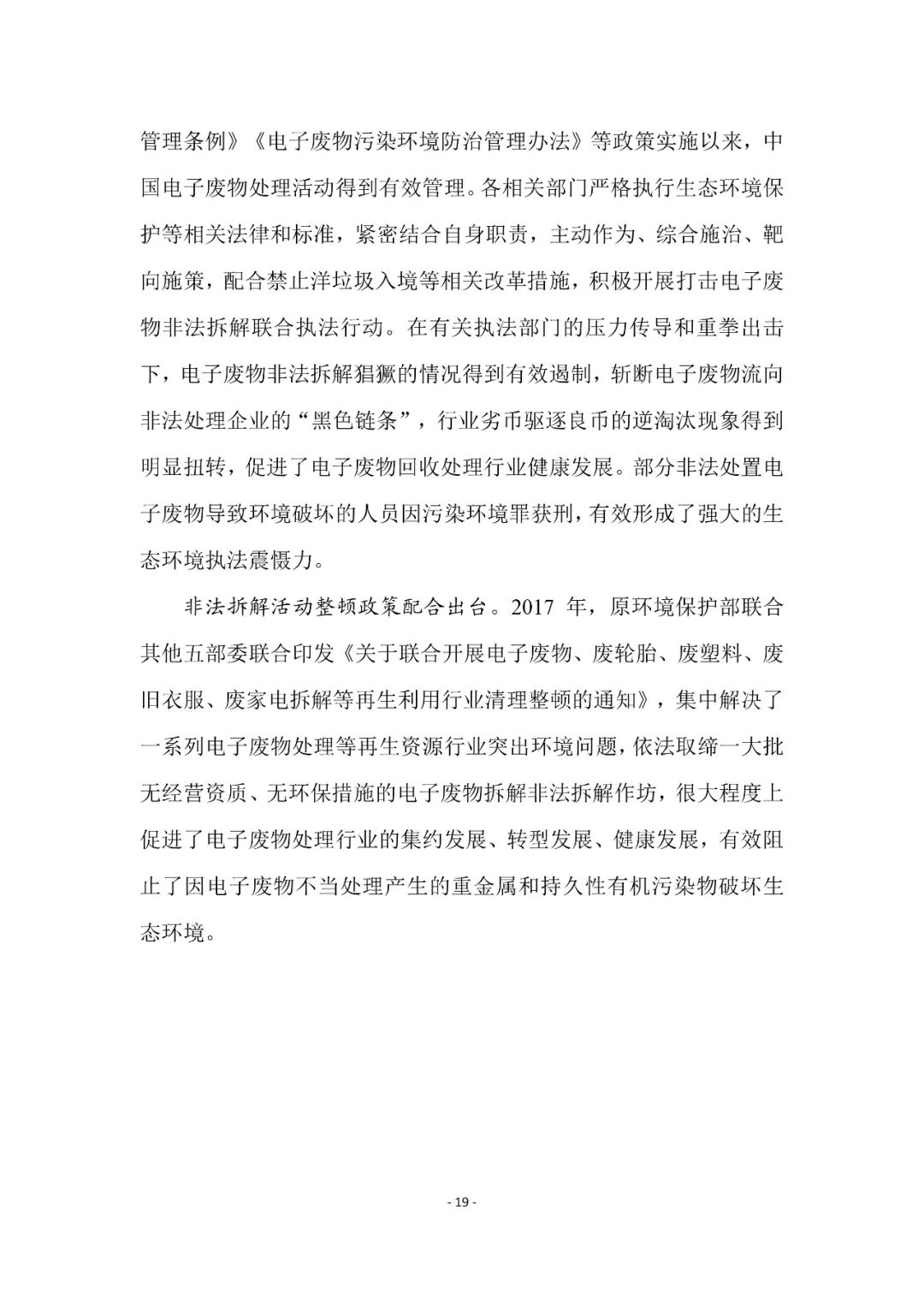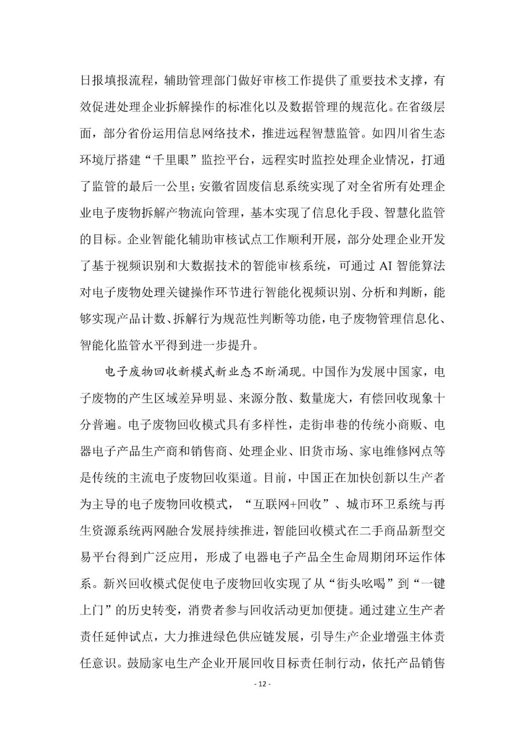 12月23日,生態(tài)環(huán)境部固體廢物與化學品管理技術中心發(fā)布《中國電子廢物環(huán)境綜合管理(2012-2021)》報告。報告從四大部分10個方面對近10年電子廢物行業(yè)發(fā)展做了系統(tǒng)闡述。近年來,中國的固體廢物污染防治的法規(guī)制度體系日臻完善,固體廢物源頭減量和資源化利用持續(xù)推進,固體廢物治理體系和治理能力得到顯著提升,為建設生態(tài)文明和美麗中國提供了堅強保障,也為其他國家和地區(qū)提供了中國經驗。為全面介紹中國電子廢物環(huán)境綜合管理理念和實踐,增進國際社會對中國電子廢物環(huán)境管理的了解,特發(fā)布本報告。(報告原文請點擊文末“閱讀原文”下載)一、堅定走生態(tài)優(yōu)先綠色低碳發(fā)展道路中國的電子廢物環(huán)境管理以全面促進資源節(jié)約集約利用為目標,全方位構建電子廢物減量化、資源化、無害化體系,切實解決老百姓身邊突出的電子廢物污染問題,積極適應新形勢新要求,扎實做好與“碳達峰、碳中和”等各項工作的對接融合,促進減污降碳協(xié)同增效,加快推動生態(tài)文明建設再上新臺階、取得新成效。二、建成以廢棄電器電子產品處理基金為核心的電子廢物環(huán)境綜合管理體系電子廢物管理是世界各國面臨的重大環(huán)境問題,中國立足國情實際,在借鑒國際實踐經驗的基礎上,形成了以廢棄電器電子產品處理基金為核心的生產者責任延伸制度,建成符合中國國情的電子廢物環(huán)境綜合管理體系,為促進資源全面節(jié)約和循環(huán)利用、保護生態(tài)環(huán)境、保障人體健康奠定了堅實基礎。(一)中國電子廢物管理制度框架日臻完善。《中華人民共和國固體廢物污染環(huán)境防治法》《中華人民共和國清潔生產促進法》《中華人民共和國循環(huán)經濟促進法》是中國電子廢物管理的法律基礎,特別是中國出臺《廢棄電器電子產品回收處理管理條例》,并發(fā)布《廢棄電器電子產品處理基金征收使用管理辦法》等配套政策文件,電子廢物環(huán)境管理體系和技術要求得到進一步完善。(二)廢棄電器電子產品處理基金成為電子廢物管理制度體系核心。中國積極探索符合國情的電器電子產品生產者責任延伸制度,通過讓電器電子產品生產者繳納基金的方式,建立了廢電器處理基金,用于廢棄電器電子產品回收處理費用的補貼,成為全球首個通過建立廢電器處理基金來實踐生產者責任延伸制度的發(fā)展中國家。2012年至2020年,中國累計發(fā)放219億元廢電器處理基金用于補貼處理企業(yè),引導約6億臺電視機、電冰箱、洗衣機、空氣調節(jié)器、微型計算機進入正規(guī)處理企業(yè),其中電視機回收率高達94%以上,電冰箱的回收率達到77%以上,處于國際領先水平,有效消除了環(huán)境風險,保障了人民群眾身體健康。在廢電器處理基金的激勵下,廢電器處理企業(yè)的發(fā)展內生動力和整體競爭力持續(xù)增強,中國的電子廢物回收處理產業(yè)實現了跨越式發(fā)展。(三)形成電子廢物齊抓共管工作格局。中國緊密圍繞廢棄電器電子產品處理基金制度,通過一系列政策設計和成功實踐,逐步形成了電子廢物齊抓共管的良好格局。各相關部門協(xié)同發(fā)力,管理范圍貫穿電器電子產品生產、流通、回收處理和循環(huán)利用的全生命周期。嚴格開展企業(yè)拆解處理情況審核,打擊非法拆解,有力保障了基金安全。三、促進電子廢物處理處置行業(yè)高質量發(fā)展中國的電子廢物處理企業(yè)規(guī)范發(fā)展與環(huán)境質量改善同步推進,顯著降低了有關生態(tài)環(huán)境風險和職業(yè)健康風險,電子廢物規(guī)范回收處理率、技術研發(fā)、產業(yè)鏈體量、環(huán)境保護要求等方面加快與國際一流水平接軌,相關從業(yè)人員和行業(yè)管理者自信心不斷增強,電子廢物處理行業(yè)邁入新的發(fā)展階段。(一)處理企業(yè)主體活力充分激發(fā)釋放。在廢電器處理基金等支持政策的激勵下,中國電子廢物產業(yè)發(fā)展活力競相迸發(fā),產業(yè)規(guī)模優(yōu)勢逐漸顯現。正規(guī)處理企業(yè)處理能力由2012年的0.46億臺/年增長至2020年的1.64億臺/年,電子廢物處理企業(yè)年實際處理量由2012年的1010萬臺增長至2020年的8498萬臺。中國的電子廢物處理企業(yè)嚴格執(zhí)行國家“以人為本,加強職業(yè)健康安全保障,改善勞動條件”的規(guī)定,從業(yè)人員職業(yè)健康和生命安全得到切實保障。(二)處理技術水平顯著增強提升。中國的電子廢物處理行業(yè)自動化、機械化、智能化、綠色化水平不斷提高,產業(yè)鏈得到延伸,價值鏈獲得提升,企業(yè)的環(huán)境污染防治措施落實落地,拆解處理工藝流程標準規(guī)范,拆解處理技術不斷革新,科技賦能應用成效顯著,引領了整個再生資源產業(yè)的高質量發(fā)展。(三)非法拆解活動得到有效遏制。有關執(zhí)法部門通過打好非法拆解整治“組合拳”,電子廢物非法拆解的情況得到遏制,促進了電子廢物回收處理行業(yè)健康發(fā)展。曾有著“電子廢物拆解第一鎮(zhèn)”之稱的廣東汕頭貴嶼鎮(zhèn),通過一系列“疏堵結合”的環(huán)境綜合整治行動,“家家拆解,戶戶冒煙;酸液排河,黑云蔽天”的情況已經絕跡,當地大氣、水體污染情況均明顯好轉,實現了由原先的無序惡性擴張