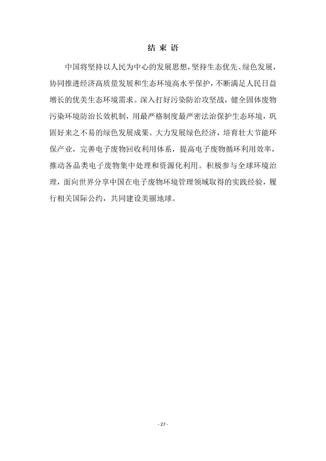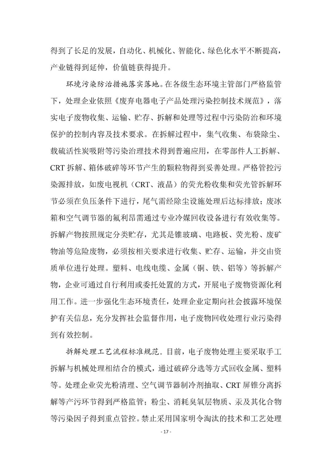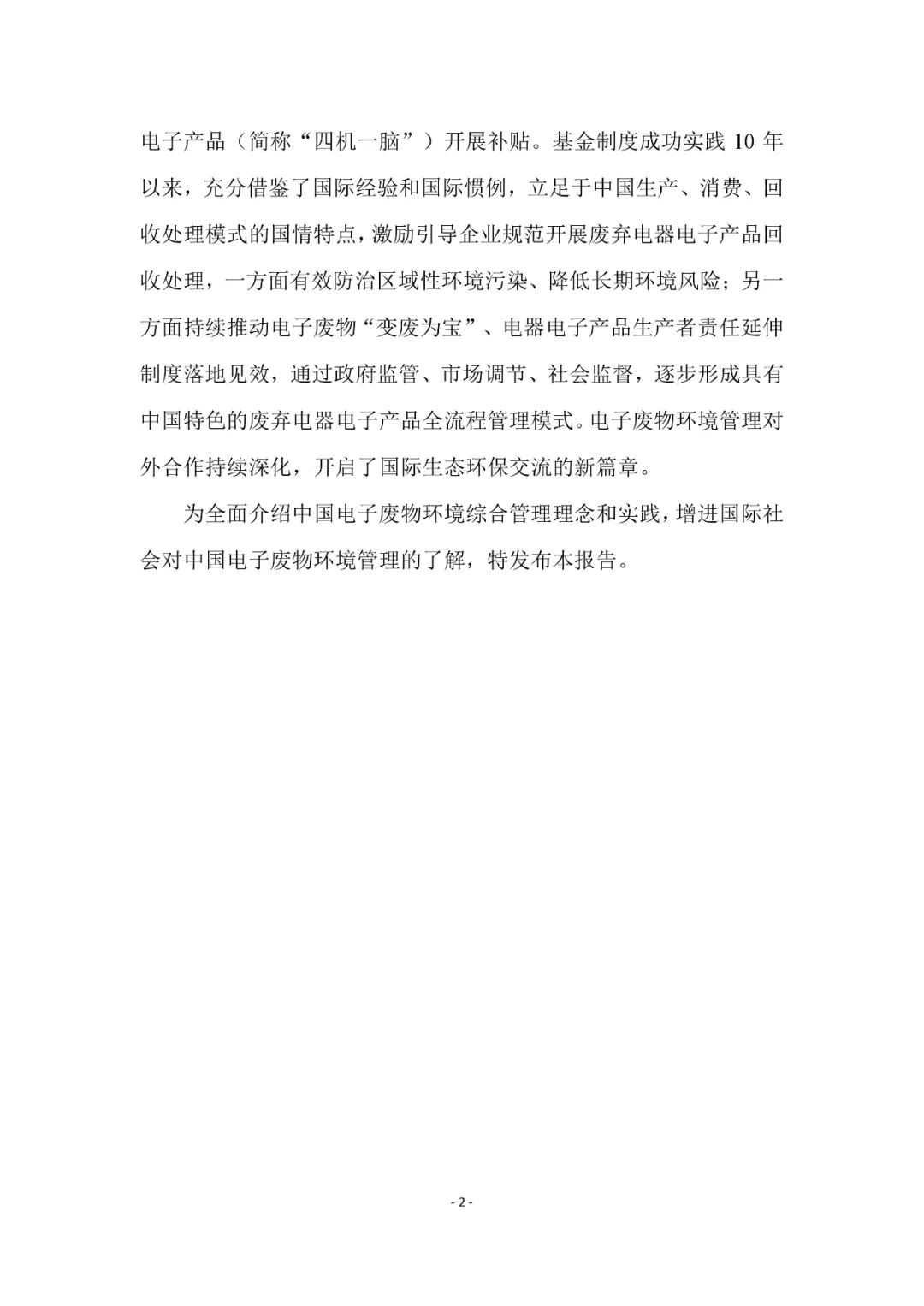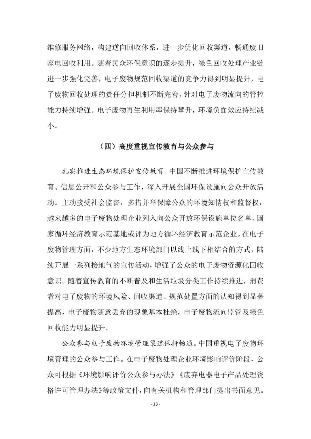 12月23日,生態(tài)環(huán)境部固體廢物與化學品管理技術中心發(fā)布《中國電子廢物環(huán)境綜合管理(2012-2021)》報告。報告從四大部分10個方面對近10年電子廢物行業(yè)發(fā)展做了系統(tǒng)闡述。近年來,中國的固體廢物污染防治的法規(guī)制度體系日臻完善,固體廢物源頭減量和資源化利用持續(xù)推進,固體廢物治理體系和治理能力得到顯著提升,為建設生態(tài)文明和美麗中國提供了堅強保障,也為其他國家和地區(qū)提供了中國經驗。為全面介紹中國電子廢物環(huán)境綜合管理理念和實踐,增進國際社會對中國電子廢物環(huán)境管理的了解,特發(fā)布本報告。(報告原文請點擊文末“閱讀原文”下載)一、堅定走生態(tài)優(yōu)先綠色低碳發(fā)展道路中國的電子廢物環(huán)境管理以全面促進資源節(jié)約集約利用為目標,全方位構建電子廢物減量化、資源化、無害化體系,切實解決老百姓身邊突出的電子廢物污染問題,積極適應新形勢新要求,扎實做好與“碳達峰、碳中和”等各項工作的對接融合,促進減污降碳協(xié)同增效,加快推動生態(tài)文明建設再上新臺階、取得新成效。二、建成以廢棄電器電子產品處理基金為核心的電子廢物環(huán)境綜合管理體系電子廢物管理是世界各國面臨的重大環(huán)境問題,中國立足國情實際,在借鑒國際實踐經驗的基礎上,形成了以廢棄電器電子產品處理基金為核心的生產者責任延伸制度,建成符合中國國情的電子廢物環(huán)境綜合管理體系,為促進資源全面節(jié)約和循環(huán)利用、保護生態(tài)環(huán)境、保障人體健康奠定了堅實基礎。(一)中國電子廢物管理制度框架日臻完善。《中華人民共和國固體廢物污染環(huán)境防治法》《中華人民共和國清潔生產促進法》《中華人民共和國循環(huán)經濟促進法》是中國電子廢物管理的法律基礎,特別是中國出臺《廢棄電器電子產品回收處理管理條例》,并發(fā)布《廢棄電器電子產品處理基金征收使用管理辦法》等配套政策文件,電子廢物環(huán)境管理體系和技術要求得到進一步完善。(二)廢棄電器電子產品處理基金成為電子廢物管理制度體系核心。中國積極探索符合國情的電器電子產品生產者責任延伸制度,通過讓電器電子產品生產者繳納基金的方式,建立了廢電器處理基金,用于廢棄電器電子產品回收處理費用的補貼,成為全球首個通過建立廢電器處理基金來實踐生產者責任延伸制度的發(fā)展中國家。2012年至2020年,中國累計發(fā)放219億元廢電器處理基金用于補貼處理企業(yè),引導約6億臺電視機、電冰箱、洗衣機、空氣調節(jié)器、微型計算機進入正規(guī)處理企業(yè),其中電視機回收率高達94%以上,電冰箱的回收率達到77%以上,處于國際領先水平,有效消除了環(huán)境風險,保障了人民群眾身體健康。在廢電器處理基金的激勵下,廢電器處理企業(yè)的發(fā)展內生動力和整體競爭力持續(xù)增強,中國的電子廢物回收處理產業(yè)實現了跨越式發(fā)展。(三)形成電子廢物齊抓共管工作格局。中國緊密圍繞廢棄電器電子產品處理基金制度,通過一系列政策設計和成功實踐,逐步形成了電子廢物齊抓共管的良好格局。各相關部門協(xié)同發(fā)力,管理范圍貫穿電器電子產品生產、流通、回收處理和循環(huán)利用的全生命周期。嚴格開展企業(yè)拆解處理情況審核,打擊非法拆解,有力保障了基金安全。三、促進電子廢物處理處置行業(yè)高質量發(fā)展中國的電子廢物處理企業(yè)規(guī)范發(fā)展與環(huán)境質量改善同步推進,顯著降低了有關生態(tài)環(huán)境風險和職業(yè)健康風險,電子廢物規(guī)范回收處理率、技術研發(fā)、產業(yè)鏈體量、環(huán)境保護要求等方面加快與國際一流水平接軌,相關從業(yè)人員和行業(yè)管理者自信心不斷增強,電子廢物處理行業(yè)邁入新的發(fā)展階段。(一)處理企業(yè)主體活力充分激發(fā)釋放。在廢電器處理基金等支持政策的激勵下,中國電子廢物產業(yè)發(fā)展活力競相迸發(fā),產業(yè)規(guī)模優(yōu)勢逐漸顯現。正規(guī)處理企業(yè)處理能力由2012年的0.46億臺/年增長至2020年的1.64億臺/年,電子廢物處理企業(yè)年實際處理量由2012年的1010萬臺增長至2020年的8498萬臺。中國的電子廢物處理企業(yè)嚴格執(zhí)行國家“以人為本,加強職業(yè)健康安全保障,改善勞動條件”的規(guī)定,從業(yè)人員職業(yè)健康和生命安全得到切實保障。(二)處理技術水平顯著增強提升。中國的電子廢物處理行業(yè)自動化、機械化、智能化、綠色化水平不斷提高,產業(yè)鏈得到延伸,價值鏈獲得提升,企業(yè)的環(huán)境污染防治措施落實落地,拆解處理工藝流程標準規(guī)范,拆解處理技術不斷革新,科技賦能應用成效顯著,引領了整個再生資源產業(yè)的高質量發(fā)展。(三)非法拆解活動得到有效遏制。有關執(zhí)法部門通過打好非法拆解整治“組合拳”,電子廢物非法拆解的情況得到遏制,促進了電子廢物回收處理行業(yè)健康發(fā)展。曾有著“電子廢物拆解第一鎮(zhèn)”之稱的廣東汕頭貴嶼鎮(zhèn),通過一系列“疏堵結合”的環(huán)境綜合整治行動,“家家拆解,戶戶冒煙;酸液排河,黑云蔽天”的情況已經絕跡,當地大氣、水體污染情況均明顯好轉,實現了由原先的無序惡性擴張