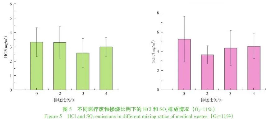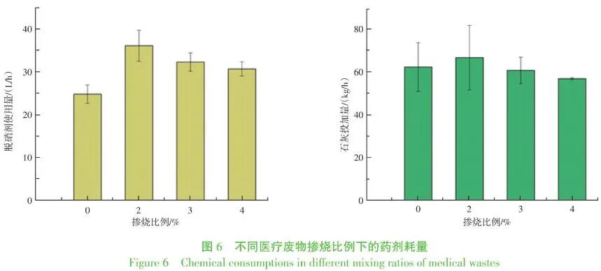 由圖4可以看出,生活垃圾日常運(yùn)行熱處理焚燒煙氣中CO本身含量較低,平均為1.72 mg/m3,遠(yuǎn)低于排放標(biāo)準(zhǔn)的限值。摻燒醫(yī)療廢物后煙氣中CO含量顯著升高,當(dāng)摻燒比例為3%時(shí),CO平均含量達(dá)13.78 mg/m3,是日常運(yùn)行工況下的8倍,但是仍然遠(yuǎn)低于標(biāo)準(zhǔn)值,其上偏差雖然有7.33 mg/m3,但是仍低于排放限值。2%和4%的摻燒比例下,煙氣中CO的含量增加,分別是日常運(yùn)行條件下的3.8倍和2.2倍,但是明顯低于摻燒比例為3%的工況。顯著性分析發(fā)現(xiàn)P<0.05,說明摻燒醫(yī)療廢物對(duì)焚燒煙氣中CO含量有明顯影響,且呈現(xiàn)增加的趨勢(shì)。這是因?yàn)獒t(yī)療廢物的熱值偏高,即使在供風(fēng)相應(yīng)地調(diào)整前提下,可能會(huì)因?yàn)榫植繜嶝?fù)荷高、在高溫區(qū)停留時(shí)間縮短而引起CO升高。 醫(yī)療廢物的Cl典型含量為1.1%~2.1%,而生活垃圾在0.2%~0.8%的水平。但是表2中數(shù)據(jù)顯示醫(yī)療廢物的Cl含量雖然偏高,但是未達(dá)到上述水平,這可能與醫(yī)療廢物的來源及取樣有關(guān)。由圖5可以看出,日常運(yùn)行焚燒煙氣中HCl平均含量為3.32 mg/m3,在生活垃圾中摻燒醫(yī)療廢物后煙氣中HCl含量略有降低,這可能是因?yàn)檫M(jìn)料波動(dòng)引起的。在2%摻燒比例下煙氣中HCl含量變化不大,僅為3.30 mg/m3,基本與日常運(yùn)行條件下的含量持平,但是石灰投加量有所增加,如圖6所示。摻燒比例為3%和4%時(shí),HCl濃度反而降低明顯,對(duì)應(yīng)地石灰的消耗量也有所降低,這可能與生活垃圾的組分波動(dòng)有關(guān),因?yàn)閾綗囼?yàn)時(shí)間長(zhǎng)達(dá)8 d,生活垃圾組分和醫(yī)療廢物組分均可能出現(xiàn)變化,也說明垃圾組分本身的波動(dòng)可能掩蓋小比例的醫(yī)療廢物摻燒的影響。
