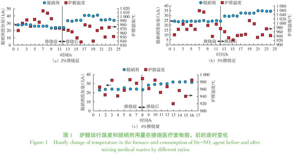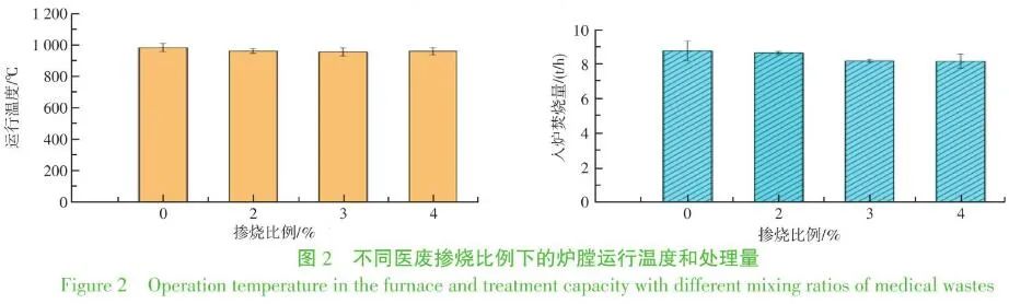 這里主要關(guān)注醫(yī)療廢物摻燒對(duì)焚燒爐爐膛溫度和焚燒處理量的影響。圖1給出每個(gè)摻燒比例前后的爐膛溫度和脫硝劑用量的逐時(shí)變化。其中摻燒比例為2%和3%(wt)時(shí),前12 h為日常運(yùn)行情況,后12 h為摻燒后的代表性工況;摻燒比例為4%(wt)時(shí),前8 h為日常運(yùn)行情況,后8 h為摻燒后的代表性工況。將上述逐時(shí)溫度按照不同醫(yī)療廢物添加量工況取平均值,結(jié)果見圖2,圖2同時(shí)給出了實(shí)際的入爐垃圾焚燒量??梢?,日常運(yùn)行爐膛內(nèi)溫度較高,平均可達(dá)982.72 ℃,在摻燒醫(yī)療廢物后爐膛溫度略有降低,這可能是由于供風(fēng)量隨著醫(yī)療廢物摻燒比例的增加而增大引起的變化,但是不同摻燒比例下運(yùn)行溫度變化不大,無顯著性差異,總體上運(yùn)行溫度在正常波動(dòng)范圍內(nèi),并高于850 ℃。