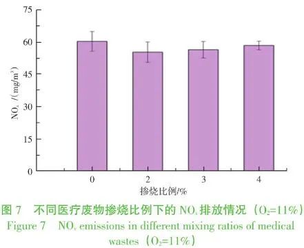 圖5顯示,日常運(yùn)行生活垃圾焚燒煙氣中SO2濃度本身有所波動(dòng),但是水平很低,平均含量為5.27 mg/m3,遠(yuǎn)低于排放限值。摻燒醫(yī)療廢物后,與HCl相比,盡管變化規(guī)律不完全一致,但是也呈現(xiàn)降低趨勢(shì),作為酸性氣體,其變化原因與HCl類似。