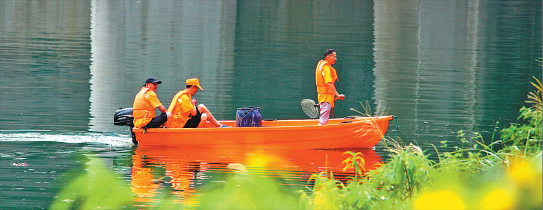 湖北省恩施市環(huán)衛(wèi)工人乘坐沖鋒舟打撈清江河面上的白色垃圾及漂浮物。譚 華攝(人民視覺)