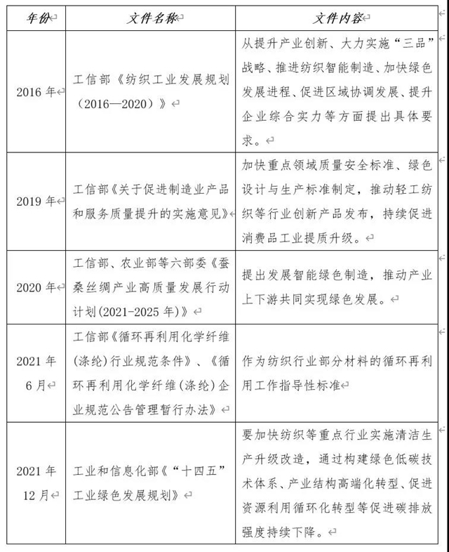 國家政策層面,自2016年起工信部聯(lián)合各部委陸續(xù)發(fā)布多個(gè)工業(yè)、制造業(yè)高質(zhì)量發(fā)展實(shí)施意見,其中多次提到紡織行業(yè)作為重要領(lǐng)域,要加快綠色制造、綠色設(shè)計(jì),推動(dòng)行業(yè)循環(huán)再利用,促進(jìn)行業(yè)高質(zhì)量綠色發(fā)展。
