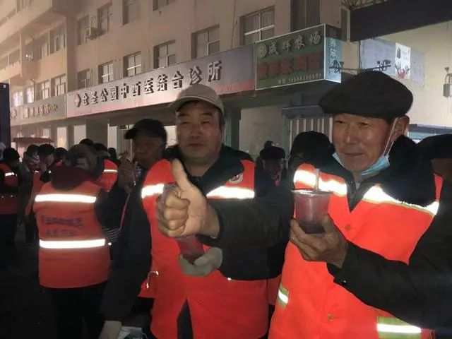 1月9日早上6時許,天色未亮,忙碌了一陣子的環(huán)衛(wèi)工人們就領(lǐng)到了濰坊壽光市志愿者們準備的熱乎乎的臘八粥。