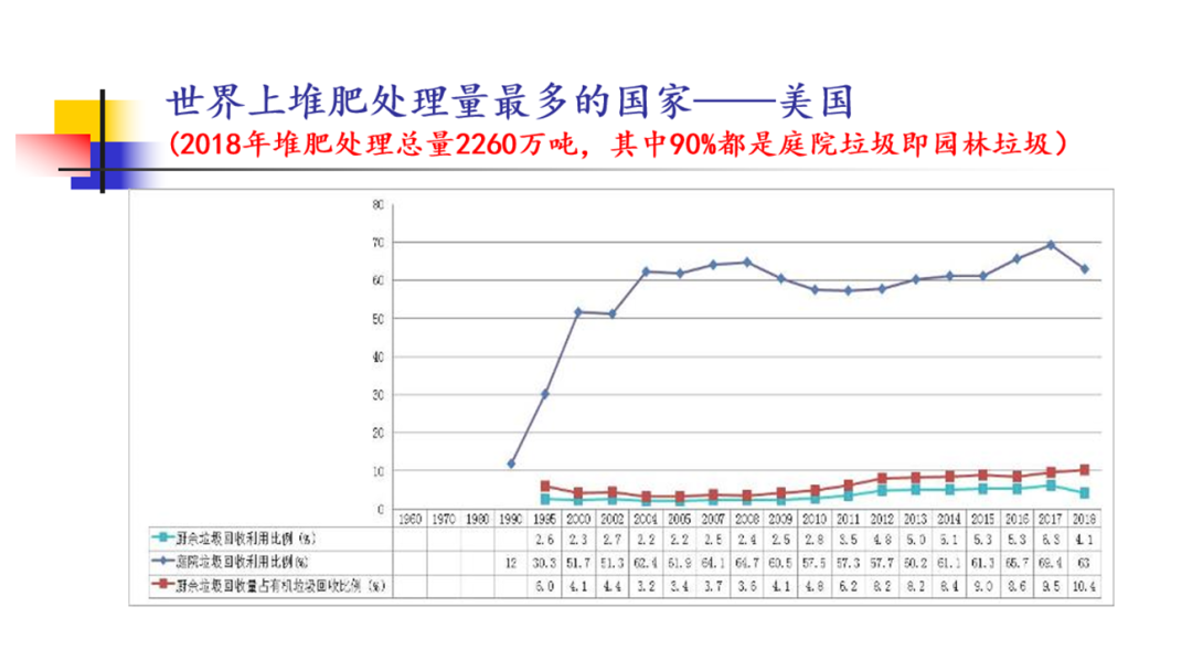 實際上,在全世界范圍內比較,生活源、家庭源廚余垃圾及庭院垃圾(園林垃圾)堆肥利用量最大的國家是美國。美國在2018年垃圾堆肥處理總量達到2260萬噸,其中90%都是園林垃圾。