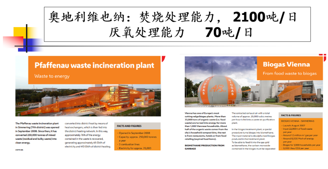 上圖是奧地利維也納的一個垃圾焚燒發(fā)電廠。可以看到該焚燒廠的一端有一個厭氧消化裝置,這個厭氧裝置主要處理從家庭分出來的廚余垃圾。我國的垃圾焚燒發(fā)電廠都有滲濾液處理裝置,且配置的比例遠遠大于圖中焚燒發(fā)電廠。圖中焚燒發(fā)電廠的焚燒能力是2100噸/日,其對應的厭氧處理能力僅是70噸/日。而國內2100噸/日的垃圾焚燒發(fā)電廠配的厭氧規(guī)模以垃圾處理規(guī)模的20%計也超過400噸/日。