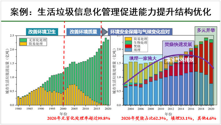 產(chǎn)生多少固廢都不清楚的情況下怎么計(jì)算減碳?劉建國(guó)表示,固廢治理首先需要借助新一代信息化技術(shù)把底數(shù)摸清楚。城市生活垃圾板塊就做了很好的示范,數(shù)據(jù)從過去的粗放狀態(tài)到近年越來越逼近真實(shí),數(shù)據(jù)呈現(xiàn)也越來越清晰。2020年城市生活垃圾無害化處理率超過99.8%,其中焚燒占比62.3%,填埋33.1%,其他4.6%,城市生活垃圾處理方式從填埋一家獨(dú)大到焚燒快速發(fā)展再到現(xiàn)在多元并舉,管理水平的提升帶來了垃圾處理方式的進(jìn)步,從最初環(huán)境衛(wèi)生問題的解決到環(huán)境質(zhì)量問題的解決,再到現(xiàn)在環(huán)境安全問題和氣侯變化的應(yīng)對(duì),其中精細(xì)化管理和信息化管理發(fā)揮了很重要的作用。
