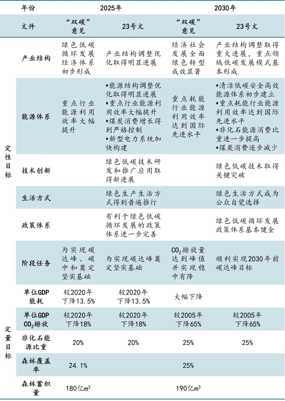 首先,《23號文》對《“雙碳”意見》中前兩階段工作目標(biāo)做了進(jìn)一步完善,針對產(chǎn)業(yè)結(jié)構(gòu)、能源體系、技術(shù)創(chuàng)新、生活方式和政策體系有了更加全面的目標(biāo)闡述。