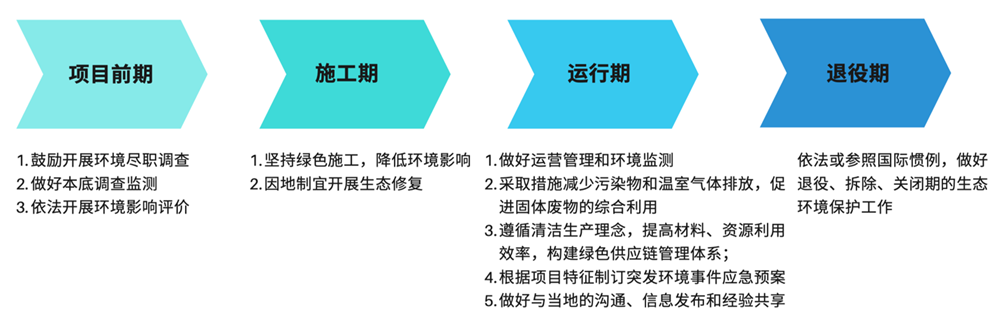 不僅如此,在為各重點行業(yè)制定環(huán)境管理要點的過程中,2022版《指南》也盡可能地體現(xiàn)了對于項目各個階段的細化要求。譬如,對于交通基礎設施項目,根據(jù)2022版《指南》的規(guī)定,企業(yè)應在項目前期做到合理選址,盡量避免對于生物多樣性的破壞;在施工期,建設相應的緩解或補償措施,并加強環(huán)境管理;在施工結束后,及時開展生態(tài)環(huán)境恢復。