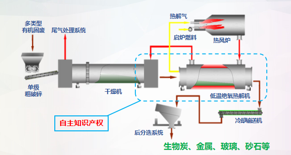 低溫絕氧熱解碳化技術(shù)是個(gè)負(fù)碳過(guò)程,也是碳中和、碳達(dá)峰的重要手段之一。其具有兩大特點(diǎn):一是,技術(shù)包容性強(qiáng),污泥、餐廚垃圾等多種類有機(jī)固廢協(xié)同處理;二是,100%資源化,熱解氣回歸系統(tǒng)再利用,終產(chǎn)物只有生物炭、金屬、玻璃、砂石。
