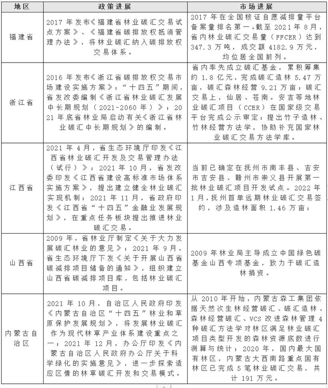 地方上,我國于2004年便啟動林業(yè)碳匯項目試點,在江西、福建、浙江、內(nèi)蒙古、遼寧等省份開展了項目的實踐落地。一方面,各省市利用既有方法學(xué)進行本地林業(yè)碳匯資源本底調(diào)查;另一方面,基于自身林業(yè)資源優(yōu)勢,各試點紛紛開展碳匯項目的政策性研究和市場布局。如下表所示,以林草資源豐富的福建、浙江、內(nèi)蒙古等省份為首,在全國核證自愿減排市場暫時停止交易的時段里持續(xù)開展碳匯項目方法學(xué)的研究以及地方市場建設(shè),為未來全國性林業(yè)碳匯交易融通打下堅實基礎(chǔ)。