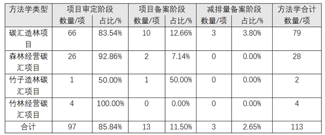 根據(jù)相關(guān)研究統(tǒng)計,整體上,在CCER市場尚未暫停的時段里,全國總計有97個項目進入項目審定階段,13個項目進入備案階段,3個項目實現(xiàn)減排量備案;在碳匯項目方法學(xué)統(tǒng)計中,碳匯造林項目方法學(xué)占比最高,其進入審定階段的項目量亦居首。