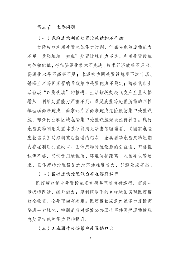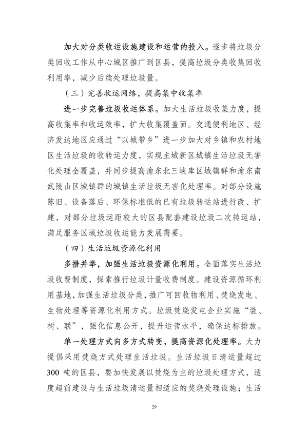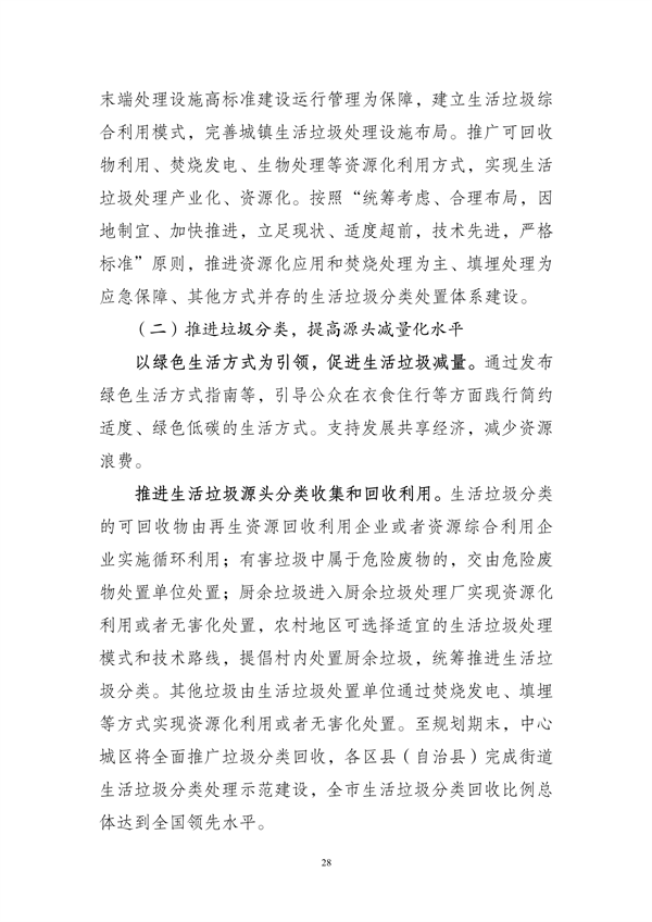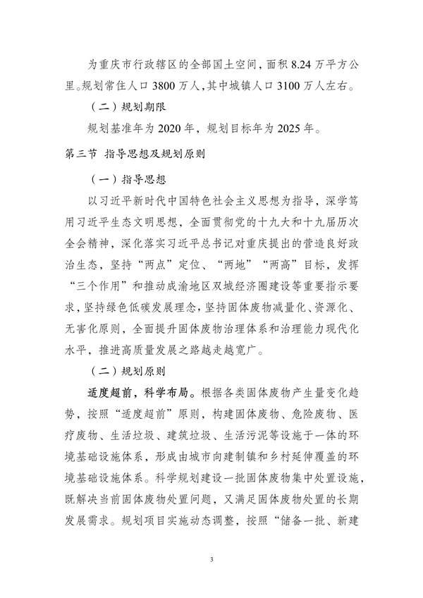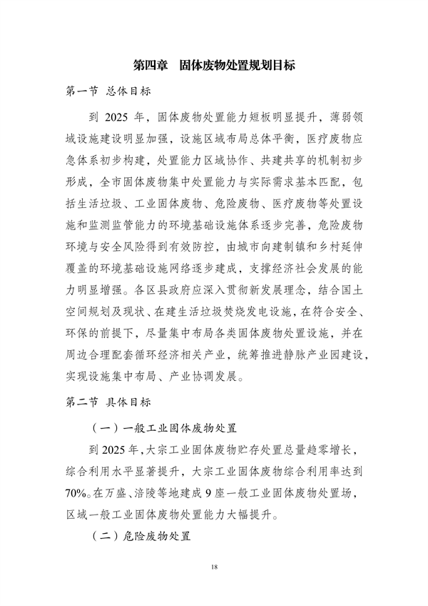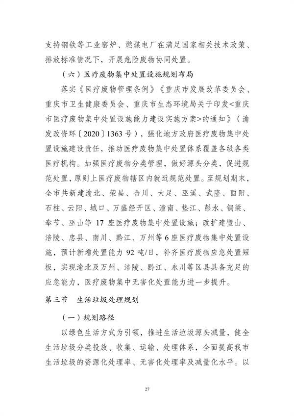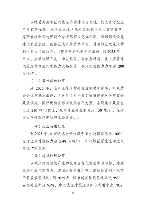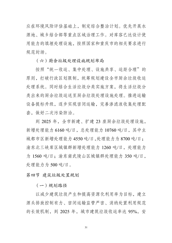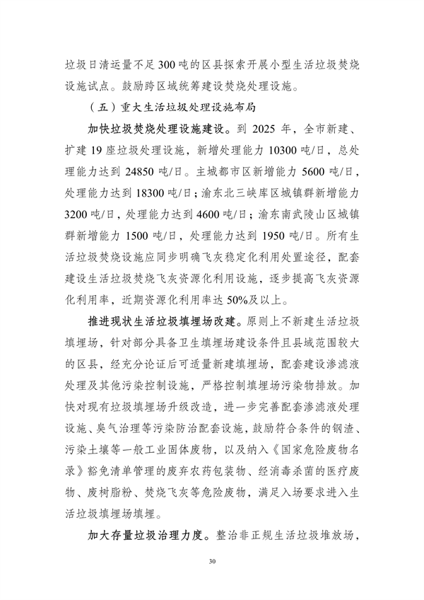 其中提出,到2025年,重慶市中心城區(qū)原生生活垃圾實(shí)現(xiàn)“零填埋”,規(guī)劃建設(shè)8個(gè)一般工業(yè)固體廢物集中處置設(shè)施建設(shè)項(xiàng)目,9個(gè)危險(xiǎn)廢物集中處置設(shè)施建設(shè)項(xiàng)目,23個(gè)醫(yī)療廢物集中處置項(xiàng)目,新、改、擴(kuò)建設(shè)合川、銅梁、綦江、奉節(jié)-巫溪、云陽等19座生活垃圾焚燒廠,新、改、擴(kuò)建設(shè)渝北、合川、永川等23座廚余垃圾處理廠,新、改、擴(kuò)建設(shè)渝北、涪陵、長壽等30座裝修垃圾填埋場。