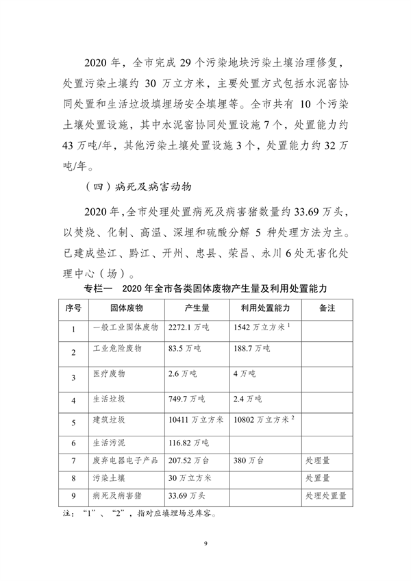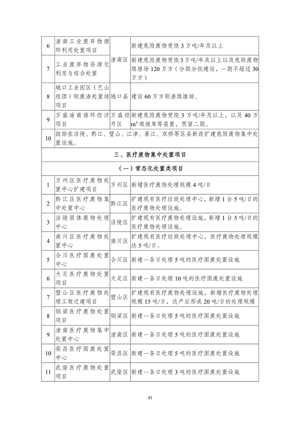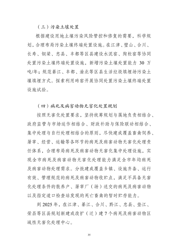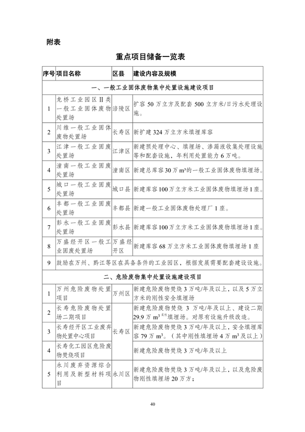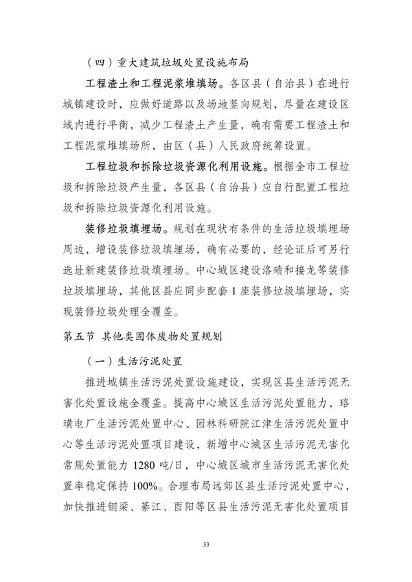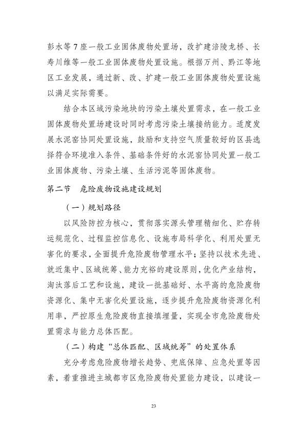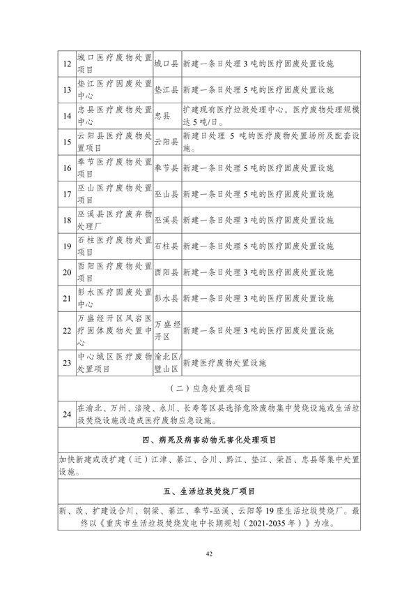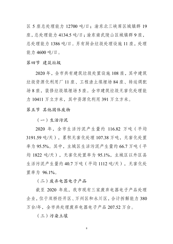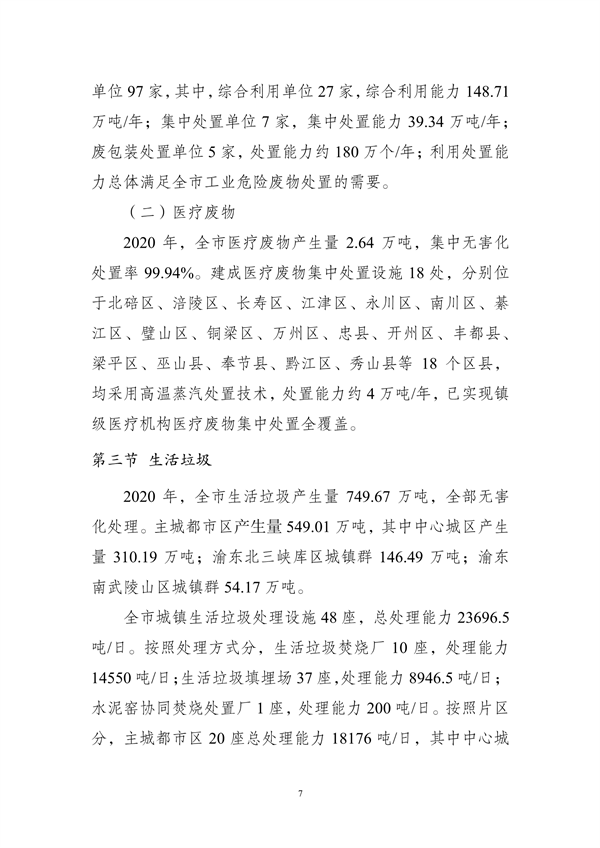 其中提出,到2025年,重慶市中心城區(qū)原生生活垃圾實(shí)現(xiàn)“零填埋”,規(guī)劃建設(shè)8個(gè)一般工業(yè)固體廢物集中處置設(shè)施建設(shè)項(xiàng)目,9個(gè)危險(xiǎn)廢物集中處置設(shè)施建設(shè)項(xiàng)目,23個(gè)醫(yī)療廢物集中處置項(xiàng)目,新、改、擴(kuò)建設(shè)合川、銅梁、綦江、奉節(jié)-巫溪、云陽等19座生活垃圾焚燒廠,新、改、擴(kuò)建設(shè)渝北、合川、永川等23座廚余垃圾處理廠,新、改、擴(kuò)建設(shè)渝北、涪陵、長壽等30座裝修垃圾填埋場。