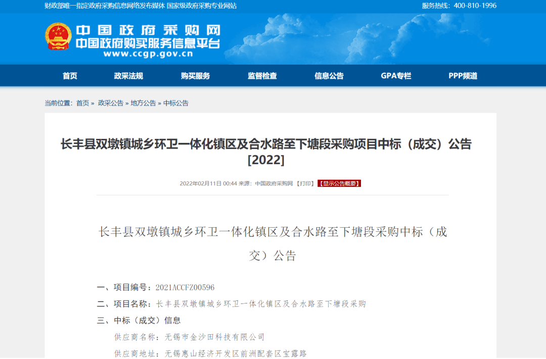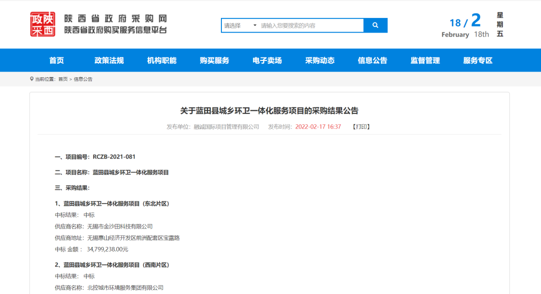 金沙田六天接連斬獲3個(gè)環(huán)衛(wèi)項(xiàng)目,總金額達(dá)4.41億元! 來源 | 環(huán)衛(wèi)科技網(wǎng)環(huán)衛(wèi)科技網(wǎng)訊,金沙田六天接連斬獲3個(gè)環(huán)衛(wèi)項(xiàng)目,總金額達(dá)4.41億元!藍(lán)田縣城鄉(xiāng)環(huán)衛(wèi)一體化服務(wù)項(xiàng)目2月17日,陜西省政府采購網(wǎng)發(fā)布藍(lán)田縣城鄉(xiāng)環(huán)衛(wèi)一體化服務(wù)項(xiàng)目的采購結(jié)果公告。金沙田中標(biāo)藍(lán)田縣城鄉(xiāng)環(huán)衛(wèi)一體化服務(wù)項(xiàng)目(東北片區(qū))標(biāo)段,中標(biāo)金額總計(jì)約3.48億元,特許經(jīng)營期10年,其中包括1年建設(shè)期。該標(biāo)段范圍覆蓋藍(lán)關(guān)街道辦(北環(huán)路以北部分)、三里鎮(zhèn)區(qū)、華胥鎮(zhèn)區(qū)及洩湖鎮(zhèn)區(qū)(包含藍(lán)田縣工業(yè)園、西北家具工業(yè)園)。未來,金沙田科技將負(fù)責(zé)提供城區(qū)道路清掃保潔、垃圾收轉(zhuǎn)運(yùn)、公廁和文明驛站運(yùn)營、綠化養(yǎng)護(hù)、垃圾分類、環(huán)衛(wèi)智慧平臺(tái)等環(huán)衛(wèi)服務(wù)。周至縣道路清掃保潔、垃圾清運(yùn)、綠化養(yǎng)護(hù)、公廁管理市場化運(yùn)作項(xiàng)目2月11日,陜西省政府采購網(wǎng)發(fā)布周至縣道路清掃保潔、垃圾清運(yùn)、綠化養(yǎng)護(hù)、公廁管理市場化運(yùn)作項(xiàng)目采購結(jié)果公告,第二標(biāo)段中標(biāo)方為金沙田,中標(biāo)金額為460.5萬元,服務(wù)期限1年。長豐縣雙墩鎮(zhèn)城鄉(xiāng)環(huán)衛(wèi)一體化鎮(zhèn)區(qū)及合水路至下塘段采購項(xiàng)目2月11日,中國政府采購網(wǎng)發(fā)布長豐縣雙墩鎮(zhèn)城鄉(xiāng)環(huán)衛(wèi)一體化鎮(zhèn)區(qū)及合水路至下塘段采購項(xiàng)目中標(biāo)(成交)公告,中標(biāo)方為金沙田,中標(biāo)金額為8792.5萬元,服務(wù)期限1年,合同1年1簽,續(xù)簽不超過2年。1、雙墩鎮(zhèn)鎮(zhèn)區(qū)范圍內(nèi)的市政道路、重要道路及道路兩側(cè)的清掃保潔;2、雙墩鎮(zhèn)鎮(zhèn)區(qū)范圍內(nèi)街道、公園、游園、廣場等衛(wèi)生保潔;3、本次招標(biāo)范圍內(nèi)所有生活垃圾收集、轉(zhuǎn)運(yùn)至陶樓合肥長豐皖能環(huán)保電力有限公司;4、雙墩鎮(zhèn)鎮(zhèn)區(qū)范圍內(nèi)繁華商業(yè)區(qū)、人群密集街道及主要交通道路路口文明勸導(dǎo)服務(wù);6、建立智慧環(huán)衛(wèi)信息管理系統(tǒng)平臺(tái)。接下來的3月份,金沙田又將會(huì)有哪些亮眼表現(xiàn)?來源 | 環(huán)衛(wèi)科技網(wǎng)