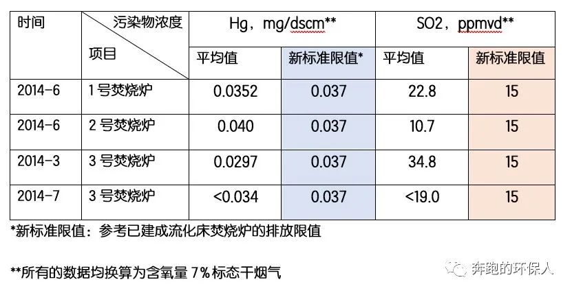 2014年的煙氣排放檢測(cè)數(shù)據(jù)顯示,煙氣中的污染物主要是汞和SO2無法滿足2016年生效的新標(biāo)準(zhǔn)排放限值,以下每個(gè)數(shù)據(jù)都是三次測(cè)試的平均值: