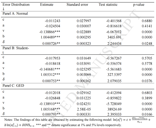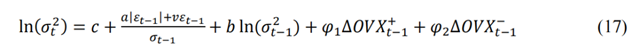 使用EGARCH模型考察原油市場(chǎng)波動(dòng)對(duì)EUA市場(chǎng)影響時(shí),發(fā)現(xiàn)在正態(tài)分布、t分布、GED分布三種假設(shè)下,OVX的系數(shù)全部顯著為正,表示原油價(jià)格波動(dòng)的上升會(huì)導(dǎo)致EUA市場(chǎng)波動(dòng)的增加,引起排放價(jià)格下降。