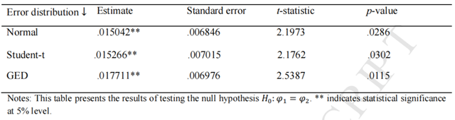 最后作者運(yùn)用預(yù)測(cè)包容檢驗(yàn)證明了將OVX加入標(biāo)準(zhǔn)EGARCH模型確實(shí)增加了有效信息,能改善模型對(duì)EUA市場(chǎng)波動(dòng)的預(yù)測(cè)表現(xiàn)。