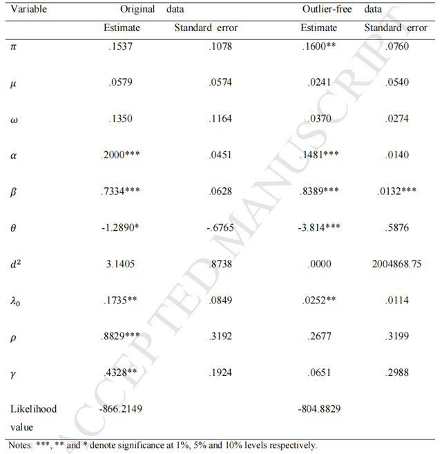 運(yùn)用AR(1)-GARCH(1,1)模型對(duì)EUA回報(bào)的時(shí)間序列進(jìn)行擬合,用擬極大似然估計(jì)法估計(jì)系數(shù),將超出正常波動(dòng)范圍的回報(bào)率視為離群數(shù)據(jù),公式如圖1。AR(1)-GARCH(1,1)模型的優(yōu)點(diǎn)是即使對(duì)誤差項(xiàng)的分布形式選擇有誤,或者模型選擇有誤,仍能準(zhǔn)確找出離群值。