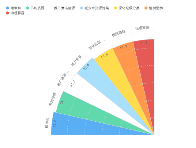 正如中國青年報也在兩會前夕做的調(diào)查結(jié)果一樣:綠色出行(60.1%)、碳中和(55.2%)、節(jié)約資源(54.0%)、推廣清潔能源(53.2%)、減少水資源污染(52.9%)、深化垃圾分類(51.6%)、植樹造林(51.3%)、治理霧霾(51.2%)。