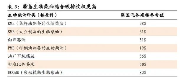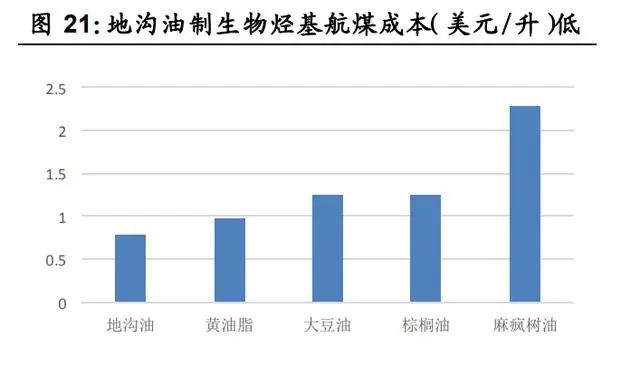 再生油:碳約束推動(dòng)需求高增,再生地溝油產(chǎn)業(yè)升級將至碳約束推動(dòng)需求高增,再生地溝油產(chǎn)業(yè)升級將至。1)碳約束刺激再生油需求,歐洲生物柴油量價(jià)將長期處于高位。2)國際政策推動(dòng)國內(nèi)地溝油利用“高端化”:車用油方面,“烴基化”趨勢明顯;航油方面,國際航協(xié)2050碳中和目標(biāo)推動(dòng)生物質(zhì)烴基航煤需求釋放。地溝油制烴基柴油附加值將較UCOME顯著提升,再生地溝油向著高端產(chǎn)品升級的產(chǎn)業(yè)趨勢明顯。1. 碳約束刺激需求,歐洲生物柴油量價(jià)將長期處于高位歐洲生物柴油需求旺盛,量價(jià)將長期處于高位。1)歐盟是全球生物柴油最大的消費(fèi)市場,目前歐盟生物柴油消費(fèi)量占全球總消費(fèi)量的 40%。2)發(fā)達(dá)國家強(qiáng)制按比例添加:伴隨《歐盟可再生能源指令》于2021年開始實(shí)施,歐洲公路運(yùn)輸行業(yè)的生物柴油摻混比例將從 10%提升至25%,需 求將在未來10年保持增長態(tài)勢。按照目前全球生物柴油產(chǎn)能計(jì)算,到2030年歐洲地區(qū)將至少出現(xiàn)1000萬噸/年的供給缺口;如果考慮美國拜登政府改變碳減排政策帶來的需求增加以及歐洲地區(qū)淘汰ILUC高風(fēng)險(xiǎn)燃料的影響,總體供給缺口將達(dá)1500萬噸/年。3)廢油脂基生物柴油(UCOME)隱含碳排放權(quán)更高,節(jié)碳效果最為突出,競爭優(yōu)勢明顯,長期處于供不應(yīng)求狀態(tài)。2. 國際政策推動(dòng)國內(nèi)地溝油利用“高端化”,產(chǎn)業(yè)升級將至目前我國地溝油資源化終端產(chǎn)物主要以脂肪酸甲酯為主,隨著國際政策驅(qū)動(dòng)以及地溝油脫氧加氫制先進(jìn)燃料生物烴基柴油/航煤技術(shù)進(jìn)入成熟階段,我國地溝油資源化終端產(chǎn)品將由脂肪酸甲酯產(chǎn)品向生物質(zhì)烴基柴 油/航煤升級,產(chǎn)品附加值將逐步提升,產(chǎn)業(yè)升級良機(jī)將至。地溝油經(jīng)加工再利用而制備的生物質(zhì)燃料,包括生物柴油、可再生柴油以及生物質(zhì)航煤:1)生物柴油是廢油脂或動(dòng)植物油脂經(jīng)酯交換或酯化制成的脂肪酸甲酯(FAME),需要與常規(guī)化石柴油摻混使用, 目前我國地溝油資源化終端產(chǎn)物主要以脂肪酸甲酯為主(UCOME);2)可再生柴油是廢油脂或動(dòng)植物油脂通過加氫和異構(gòu)化得到的烴基柴油(HVO/HEFA),為國際認(rèn)可的先進(jìn)生物燃料,可完全替代化 石柴油或與化石柴油制成調(diào)和燃料;3)生物質(zhì)航煤是由廢油脂經(jīng)加氫處理得到 HEFA 后,經(jīng)異構(gòu)化生成。國際政策推動(dòng)國內(nèi)地溝油利用“高端化”:1)車用油“烴基化”趨勢明顯。未來伴隨歐洲對于添加比例、排放標(biāo)準(zhǔn)等約束趨嚴(yán),車用油面臨“烴基化”趨勢,生物柴油將向著可再生柴油方向升級。2) 國際航協(xié) 2050碳中和目標(biāo)推動(dòng)生物質(zhì)烴基航煤需求釋放。國際航協(xié)設(shè)立2050年實(shí)現(xiàn)碳中和的強(qiáng)制性目標(biāo),生物質(zhì)航煤作為主要減 排手段需求量將攀升。①作為高排放行業(yè)之一,2019年航空業(yè)占全 球碳排放量的 2%。②國際航協(xié)(IATA)于 2021 年 10 月通過決議, 290 個(gè)成員航司在 2050 年實(shí)現(xiàn)碳中和,助力實(shí)現(xiàn)巴黎協(xié)定控制溫升 的目標(biāo)。計(jì)劃減排量相當(dāng)于 2050 年前累計(jì)減排 212 億噸二氧化碳 當(dāng)量。③現(xiàn)有技術(shù)中,生物質(zhì)航煤為主的環(huán)保航空燃料將為主要的 減排手段,環(huán)保燃料預(yù)計(jì)貢獻(xiàn) 65%碳減排量。IATA 初步目標(biāo)為, 2025 年環(huán)保航空燃料產(chǎn)量由 2019 年的 1.4 億升提升至 79 億升, IEA 測算全球生物質(zhì)航煤的產(chǎn)量在 2021 至 2026CAGR77%。以地溝油等廢油脂作為原材料的生物烴基航煤(HFEA)目前已技術(shù)成熟、成本相對較低、得油率較高。1)HFEA 作為目前唯一進(jìn)入 商業(yè)化應(yīng)用階段的生物質(zhì)航煤技術(shù),生產(chǎn)成本為 0.88 歐元/升,為各 技術(shù)中最低,且得油率為 0.9,遠(yuǎn)高于其他技術(shù)得油率(Pavlenko et al., 2019)。2)據(jù)IRENA,地溝油生產(chǎn)生物質(zhì)烴基航煤的成本低于 大豆油、棕櫚油,根據(jù)現(xiàn)有資料測算,地溝油航煤成本僅相當(dāng)與棕 櫚油航煤的 62%,具有較強(qiáng)的成本優(yōu)勢。再生地溝油產(chǎn)品附加值將逐步提升,產(chǎn)業(yè)升級良機(jī)將至。受到成本和隱含碳稅影響,目前海外的生物質(zhì)航煤價(jià)格遠(yuǎn)高于化石航煤,生 物質(zhì)航煤的需求基本都是受到政策驅(qū)動(dòng)。據(jù) Argus media 統(tǒng)計(jì),2020 年生物質(zhì)航煤價(jià)格為化石航煤的 3-6 倍。地溝油制生物質(zhì)航煤產(chǎn)品 附加值將較 UCOME 顯著提升,再生地溝油向著高端產(chǎn)品升級的產(chǎn) 業(yè)趨勢明顯。再生塑料:政策推動(dòng)需求釋放,PET 瓶對瓶高端回收應(yīng)用替換速度超預(yù)期 回收再生利用為廢塑料的最佳處置方式。再生塑料節(jié)能減碳,為實(shí)現(xiàn)碳 中和的重要手段之一。政策驅(qū)動(dòng)全球再生塑料需求釋放,PET瓶對瓶高 端回收應(yīng)用替換速度超預(yù)期。塑料垃圾泄露到環(huán)境中難以降解帶來危害,其污染治理是世界性難題,對我國來說也亟待解決。1)塑料垃圾產(chǎn)生量快速增加。根據(jù)