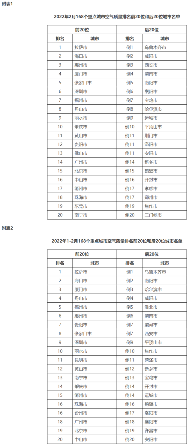 1—2月,168個(gè)重點(diǎn)城市中,拉薩、??诤蛷B門市等20個(gè)城市空氣質(zhì)量相對(duì)較好(從第1名至第20名);烏魯木齊、南陽(yáng)和哈爾濱市等20個(gè)城市空氣質(zhì)量相對(duì)較差(從倒數(shù)第1名至倒數(shù)第20名),見附表2。