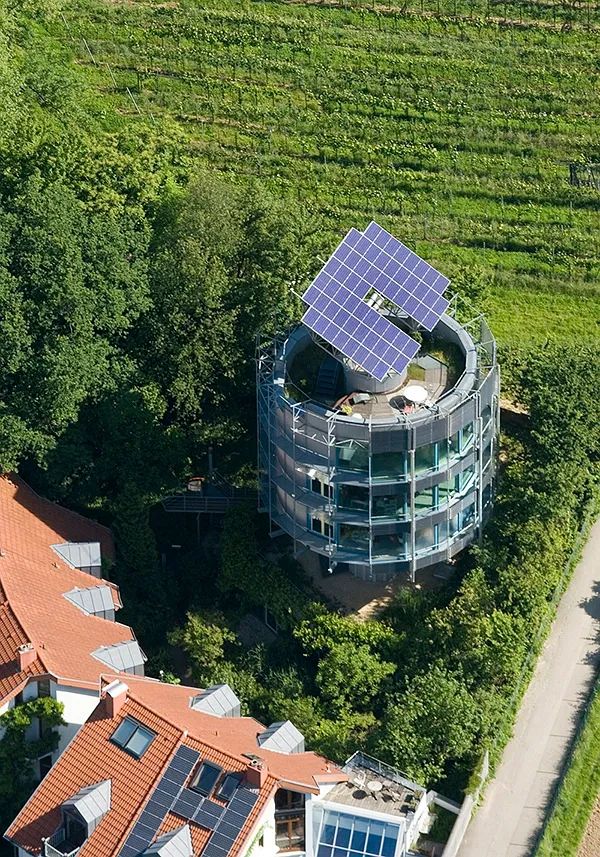 在德國巴登符騰堡州弗萊堡市內(nèi)有一片綠色的建筑“森林”,包含150棟可以進行“光合作用”的再生能源屋。其中一座建筑尤為特別,通過控制程序,它能夠像向日葵一樣,跟隨太陽位置進行旋轉(zhuǎn),從而保證屋頂和立面的太陽能光電板組最大化地實現(xiàn)光電轉(zhuǎn)換。