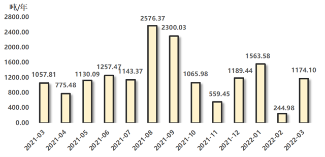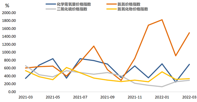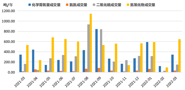 排污權(quán)成交量指標(biāo)止跌回升,四項污染物指標(biāo)同步上行。2022年3月,四項排污權(quán)成交量合計為1174.10噸,環(huán)比增長379.27%,與上年同期相比增長10.99%。