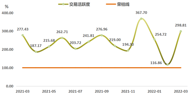 2022年3月,浙江省排污權(quán)交易活躍度指數(shù)值為298.81點,環(huán)比上行155.69%,與上年同期相比上行7.71%。