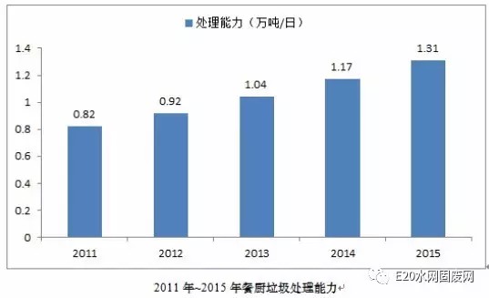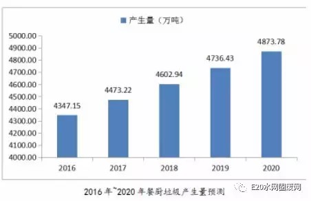 E20研究院的《餐廚垃圾處理市場分析報告(2016)》指出,近年來我國經濟快速發(fā)展,餐廚垃圾以每年10%的增量不斷增長。按照城鎮(zhèn)人口每人每天產生0.15kg餐廚垃圾計算,我國2011年的餐廚垃圾產生量為3782萬噸,到2015年我國的餐廚垃圾產生量增長到了4222萬噸。我國餐廚垃圾處理行業(yè)也在2015年迎來了市場的集中爆發(fā)期。預計2016年我國餐廚垃圾的產生量為4347萬噸,到“十三五”末期,我國的餐廚垃圾產生量將增長至4873萬噸,餐廚垃圾處理形勢嚴峻。