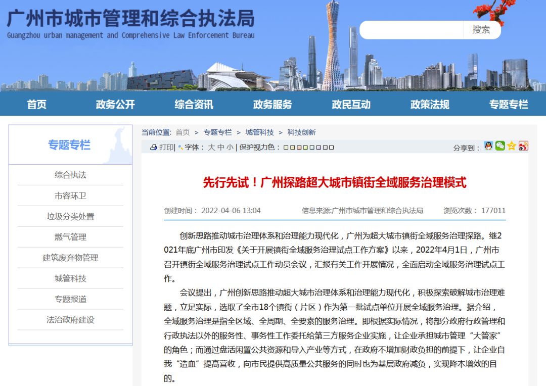 創(chuàng)新思路推動(dòng)城市治理體系和治理能力現(xiàn)代化,廣州為超大城市鎮(zhèn)街全域服務(wù)治理探路。鳳凰網(wǎng)廣東自市城市管理綜合執(zhí)法局獲悉,繼2021年底廣州市印發(fā)《關(guān)于開展鎮(zhèn)街全域服務(wù)治理試點(diǎn)工作方案》以來(lái),2022年4月1日,廣州市召開鎮(zhèn)街全域服務(wù)治理試點(diǎn)工作動(dòng)員會(huì)議,匯報(bào)有關(guān)工作開展情況,全面啟動(dòng)全域服務(wù)治理試點(diǎn)工作。