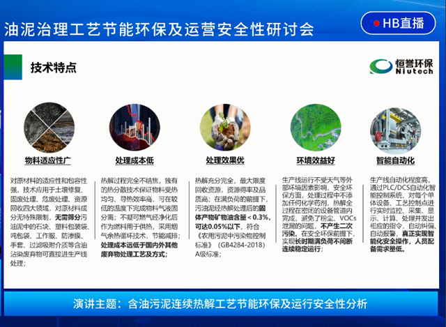 恒譽(yù)環(huán)保高級(jí)工程師童蘭英在《含油污泥連續(xù)熱解工藝節(jié)能環(huán)保及運(yùn)行安全性分析》的主題演講中強(qiáng)調(diào),熱解工藝及設(shè)備只有在滿足供熱溫度、熱傳導(dǎo)效率、導(dǎo)熱面積、停留時(shí)間、工作壓力、防聚合工藝六大關(guān)鍵要素實(shí)現(xiàn)有機(jī)匹配,才能實(shí)現(xiàn)工藝設(shè)備安全、環(huán)保、節(jié)能低耗。為此,恒譽(yù)環(huán)保對(duì)應(yīng)開(kāi)發(fā)了無(wú)結(jié)焦技術(shù)、熱氣密技術(shù)、防聚合技術(shù)、熱解關(guān)鍵要素最優(yōu)匹配技術(shù)、低溫?zé)峤饧夹g(shù)、組合式煙氣凈化技術(shù)、全密封技術(shù)、專有控制技術(shù)八大核心技術(shù)。恒譽(yù)環(huán)保連續(xù)熱解工藝在物料適應(yīng)性、經(jīng)濟(jì)性、處理效果、環(huán)境效益以及智能自動(dòng)化方面都取得良好的表現(xiàn),并成功應(yīng)用于國(guó)內(nèi)外多個(gè)項(xiàng)目。