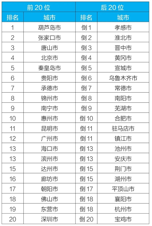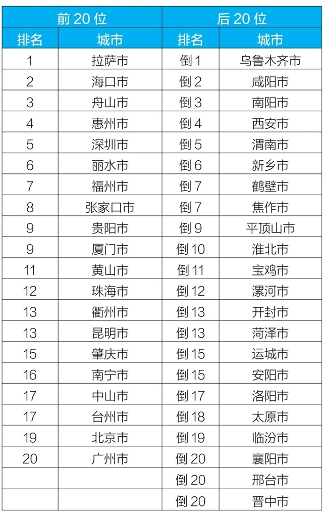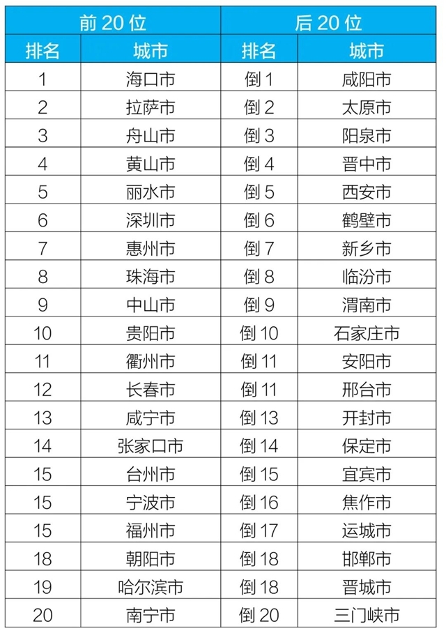 3月,168個(gè)重點(diǎn)城市中,??凇⒗_和舟山市等城市空氣質(zhì)量相對(duì)較好(從第1名至第20名);咸陽、太原和陽泉市等城市空氣質(zhì)量相對(duì)較差(從倒數(shù)第1名至倒數(shù)第20名),見附表1。
