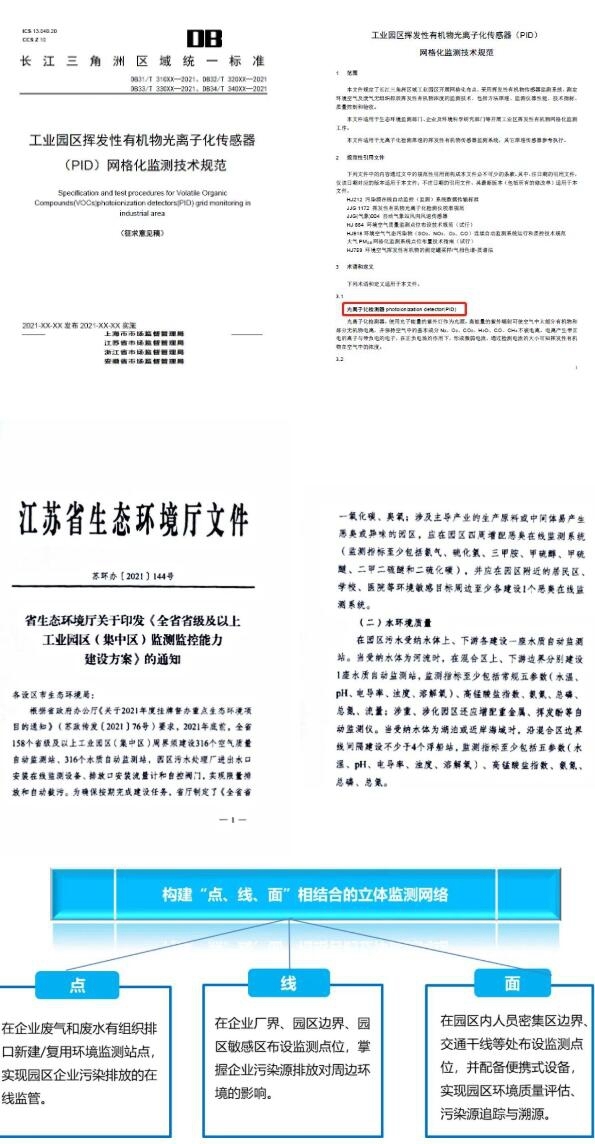 為此上海、江蘇、浙江、安徽四省四地市場(chǎng)監(jiān)督管理局聯(lián)合編制針對(duì)長(zhǎng)三角區(qū)域的《工業(yè)園區(qū)揮發(fā)性有機(jī)物光離子化傳感器(PID)網(wǎng)格化監(jiān)測(cè)技術(shù)規(guī)范》文件中要求:在區(qū)域工業(yè)園區(qū)開(kāi)展網(wǎng)格化布點(diǎn),采用揮發(fā)性有機(jī)物傳感器監(jiān)測(cè)系統(tǒng),測(cè)定環(huán)境空氣及廢氣無(wú)組織排放揮發(fā)性有機(jī)物濃度的監(jiān)測(cè)技術(shù)。與此同時(shí),江蘇省生態(tài)環(huán)境廳于2021年發(fā)布《全省省級(jí)及以上工業(yè)園區(qū)(集中區(qū))監(jiān)測(cè)監(jiān)控能力建設(shè)方案》(蘇環(huán)辦【2021】144號(hào))(以下簡(jiǎn)稱(chēng)《方案》),《方案》提出涉及主導(dǎo)產(chǎn)業(yè)的生產(chǎn)原料或中間體易產(chǎn)生惡臭或異味的園區(qū)應(yīng)在園區(qū)四周增配惡臭在線監(jiān)測(cè)系統(tǒng)。