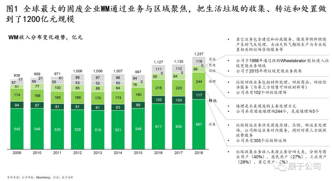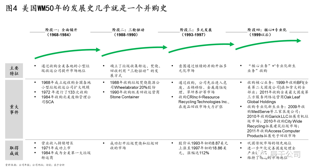 美國WM的50年發(fā)展幾乎就是一個并購史,可分為四個階段(見圖4):1968~1984年全面鋪開階段,通過收購全美各地的小型垃圾收運公司提升市場地位,其中1972 年就進行了133 次收購,1984年收購北美廢物管理公司SCA之后,成為全美第一大垃圾運轉(zhuǎn)商;1988~1990年三輪驅(qū)動階段,確立了垃圾收集轉(zhuǎn)運、焚燒、回收利用“三輪驅(qū)動”的發(fā)展方式,通過并購垃圾焚燒能源公司W(wǎng)heelabrator和紙類回收運營商Stone Container等手段實現(xiàn);1993~1997年多元發(fā)展階段,WM意圖通過大舉并購開拓多元化市場,通過收購先后進入危廢、石棉移除、金屬腐蝕處理、草坪養(yǎng)護等市場,股價從1993年初的8.87美元上漲至1997年初的18.86 美元,漲幅達112%(不過事后證明這個階段的過度多元化并購是失敗的);1999年以后WM開始專注在核心業(yè)務+專業(yè)化新生業(yè)務的并購,其中核心業(yè)務收購了BFI(全美第二大固廢公司)在加拿大的全部業(yè)務和全美最大固廢第三方服務網(wǎng)絡運營商Oak Leaf Global Holdings,這些并購不僅鞏固了WM傳統(tǒng)市場的領先地 U7Y位,也完善了固廢處理全產(chǎn)業(yè)鏈布局。