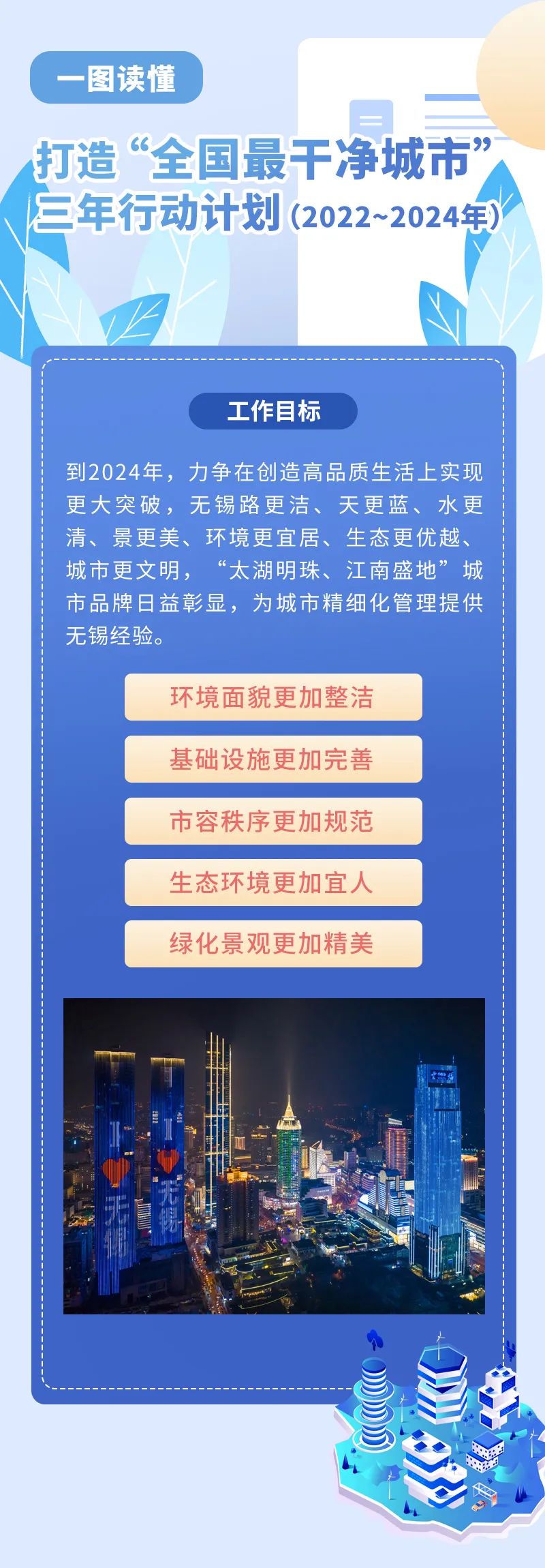 無(wú)錫市近日下發(fā)《打造“全國(guó)最干凈城市”三年行動(dòng)計(jì)劃(2022-2024年)》。去年底,無(wú)錫市政府印發(fā)《關(guān)于推進(jìn)無(wú)錫市區(qū)環(huán)衛(wèi)一體化作業(yè)改革的實(shí)施意見(jiàn)》。 在城市里旅游,除了特色景點(diǎn)、公共設(shè)施外,城市的干凈程度對(duì)游客而言是非常重要的印象分。而對(duì)于居住在這座城市的市民來(lái)說(shuō),清新的空氣、整潔的街道、蔥郁的綠化、清澈的水體,就算每天只在街巷里活動(dòng),也能覺(jué)得心曠神怡。當(dāng)前,城市發(fā)展中宜居、綠色、韌性、智慧、人文等需求更加凸顯,城市綜合實(shí)力和核心競(jìng)爭(zhēng)力的比拼,越來(lái)越外在體現(xiàn)為城市環(huán)境的比拼、城市品質(zhì)的比拼。“梧桐鳳凰棲,花香蝶自來(lái)”。打造“全國(guó)最干凈城市”就是在提升營(yíng)商環(huán)境,就是在優(yōu)化創(chuàng)新創(chuàng)業(yè)環(huán)境。為此,無(wú)錫市發(fā)布了打造“全國(guó)最干凈城市”三年行動(dòng)計(jì)劃:到2024年,力爭(zhēng)在創(chuàng)造高品質(zhì)生活上實(shí)現(xiàn)更大突破,無(wú)錫路更潔、天更藍(lán)、水更清、景更美、環(huán)境更宜居、生態(tài)更優(yōu)越、城市更文明,“太湖明珠、江南盛地”城市品牌日益彰顯,為城市精細(xì)化管理提供無(wú)錫經(jīng)驗(yàn)。 說(shuō)到干凈城市,過(guò)去大家的印象無(wú)非是主次干道、街巷路面清潔,沒(méi)有違法建筑和違法戶外廣告,垃圾、污水無(wú)害化處理率高,城市綠化面積多等??偠灾?,只要城市的清掃保潔落實(shí)到位就行。如今,僅僅是環(huán)衛(wèi)意義上的干凈已不能滿足全市人民對(duì)美好生活的向往。
