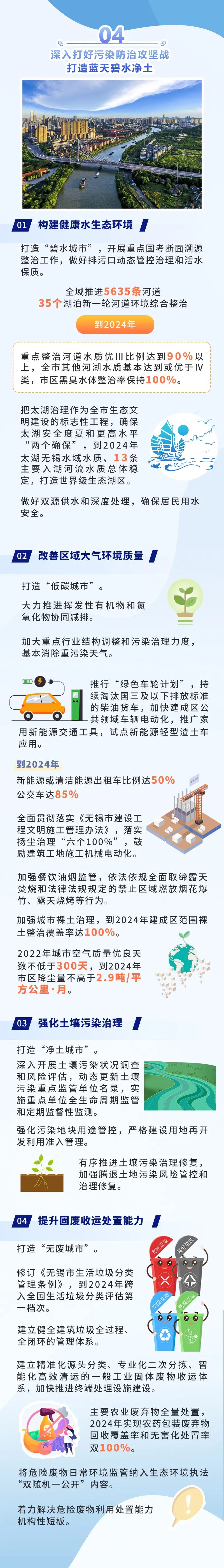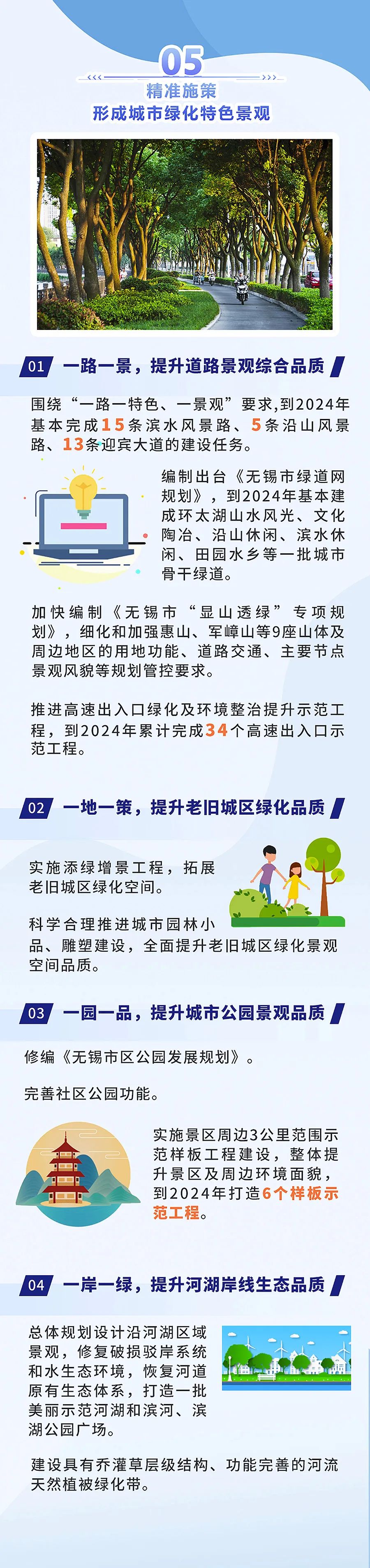 ●環(huán)境面貌更加整潔。到2024年,全市主次干道潔凈度100%、背街小巷潔凈度90%、河湖水面潔凈度100%、綠化區(qū)域潔凈度100%、小區(qū)環(huán)境潔凈度90%,打造“席地而坐”城市客廳示范區(qū)100個(gè)。●基礎(chǔ)設(shè)施更加完善。2000年底前建成的老舊小區(qū)改造率100%,完成街巷(街區(qū))品質(zhì)提升改造項(xiàng)目100個(gè),建成區(qū)一類(lèi)環(huán)衛(wèi)公廁比例25%;基礎(chǔ)設(shè)施管養(yǎng)到位,主要道路黑色化、標(biāo)線本色化95%,人行道板完好率95%,路燈設(shè)施亮燈率99%,戶外廣告設(shè)施整潔完好率95%,城市家具清潔完好率98%。●市容秩序更加規(guī)范。市區(qū)道路停車(chē)泊位管理覆蓋率100%,三亂小廣告治理覆蓋率100%,市容環(huán)衛(wèi)責(zé)任區(qū)履約率100%,顯見(jiàn)性市容違法行為“動(dòng)態(tài)清零”。●生態(tài)環(huán)境更加宜人。重污染天氣基本消除,空氣質(zhì)量?jī)?yōu)良天數(shù)比例達(dá)到82%以上,PM2.5年均濃度達(dá)到27微克/立方米;城市黑臭水體全面消除,地表水國(guó)省考斷面優(yōu)Ⅲ比例達(dá)到90%以上;土壤環(huán)境風(fēng)險(xiǎn)有效管控,重點(diǎn)建設(shè)用地安全利用率達(dá)到100%;固體廢棄物無(wú)害化處置率、資源化利用率達(dá)到和保持全國(guó)領(lǐng)先水平,城鄉(xiāng)生活垃圾分類(lèi)覆蓋率100%,保持生活垃圾無(wú)害化處理率100%,生活垃圾回收利用率36%,一般工業(yè)固廢綜合利用率98%。●綠化景觀更加精美。高品質(zhì)建設(shè)和改造提升城市綠化,形成有特色、有人文、生態(tài)化的景觀新風(fēng)格,建成區(qū)綠化覆蓋率達(dá)到43%,人均公園綠地面積達(dá)到14.9平方米,萬(wàn)人擁有綜合公園指數(shù)≥0.06,公園綠地10分鐘服務(wù)圈覆蓋率達(dá)到90%,建設(shè)城市骨干綠道100公里,建成國(guó)家生態(tài)園林城市。打造“全國(guó)最干凈城市”,不是空洞的口號(hào)、不是泛化的要求,而要體現(xiàn)在具體落實(shí)和實(shí)際效果上。打造可觀可感的“物之美”。全市每年完成30個(gè)街巷(街區(qū))品質(zhì)提升改造項(xiàng)目,培育建設(shè)特色街、精品街;到2024年,主次干道空中管線入地率達(dá)30%以上;全面設(shè)計(jì)改造沿街廣告設(shè)施和店招標(biāo)牌,實(shí)現(xiàn)共性設(shè)置與個(gè)性挖潛融合互生;對(duì)4大類(lèi)45項(xiàng)城市家具分級(jí)分類(lèi)提升改造,著力打造和諧、生態(tài)、舒適的“城市會(huì)客廳”,每年新改建和優(yōu)化提升休憩座椅2000個(gè),使生態(tài)業(yè)態(tài)、風(fēng)格風(fēng)貌、家具小品等城市要素與周邊環(huán)境、人文特色相得益彰,城市亮化、城市更新、基礎(chǔ)設(shè)施建設(shè)等方方面面精彩紛呈,讓人情不自禁“會(huì)心一笑”。打造無(wú)所不在的“凈之美”。路面平整衛(wèi)生、干凈清爽,街區(qū)秩序井然、席地可坐,公共空間長(zhǎng)治久潔,地下空間集約高效,垃圾分類(lèi)蔚然成風(fēng),城市中的細(xì)節(jié)與質(zhì)感詮釋著美好生活該有的模樣。城市干凈不干凈,“席地而坐”是一個(gè)標(biāo)準(zhǔn)。通過(guò)打造最干凈道路街巷、打造最干凈居住區(qū)、打造最干凈鄉(xiāng)村、打造最干凈河湖,建成“席地而坐”城市客廳示范區(qū)100個(gè),實(shí)現(xiàn)居民小區(qū)與城市道路環(huán)境的有序銜接,使省級(jí)特色田園鄉(xiāng)村達(dá)到50個(gè)。 打造詩(shī)意棲居的“景之美”。一路一景,提升道路景觀綜合品質(zhì);一地一策,提升老舊城區(qū)綠化品質(zhì);一園一品,提升城市公園景觀品質(zhì);一岸一綠,提升河湖岸線生態(tài)品質(zhì)。到2024年,全市基本完成15條濱水風(fēng)景路、5條沿山風(fēng)景路、13條迎賓大道的建設(shè)任務(wù);重點(diǎn)整治河道水質(zhì)優(yōu)Ⅲ比例達(dá)到90%以上,太湖無(wú)錫水域水質(zhì)、13條主要入湖河流水質(zhì)總體穩(wěn)定,打造世界級(jí)生態(tài)湖區(qū);還要進(jìn)入全國(guó)生活垃圾分類(lèi)評(píng)估第一檔次,打造“無(wú)廢城市”。屆時(shí),藍(lán)天綠地、銜山抱水的“大生態(tài)”格局基本形成,春能見(jiàn)花、夏能見(jiàn)綠、秋能見(jiàn)果、冬能見(jiàn)青的公園城市觸手可及,為生活、工作在其中的市民增添更多暖意、愜意、詩(shī)意。