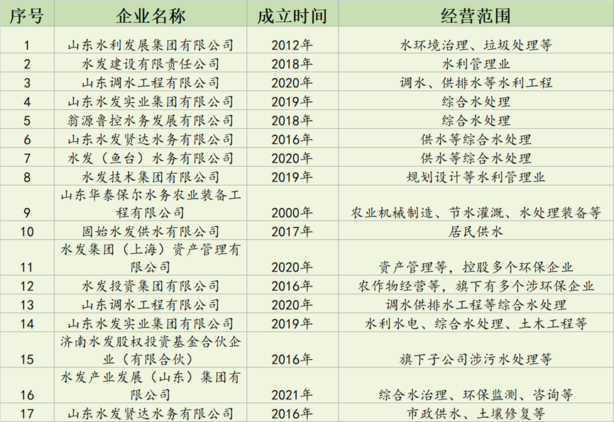 據(jù)中國水網(wǎng)不完全統(tǒng)計(jì),水發(fā)集團(tuán)旗下涉足環(huán)保的企業(yè)有17家: