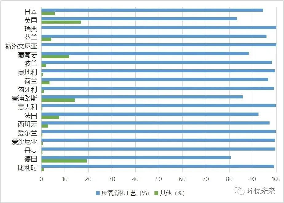 由圖1可以看出,目前發(fā)達國家的廚余垃圾處理技術(shù)主要以厭氧消化為主,約占市場份額的9成左右。其主要原因是相比于堆肥等其他處理技術(shù),厭氧消化技術(shù)更加環(huán)保和先進,受到業(yè)內(nèi)的廣泛關(guān)注,逐步形成一套成熟的產(chǎn)業(yè)鏈,進而得到市場的認可和推廣。