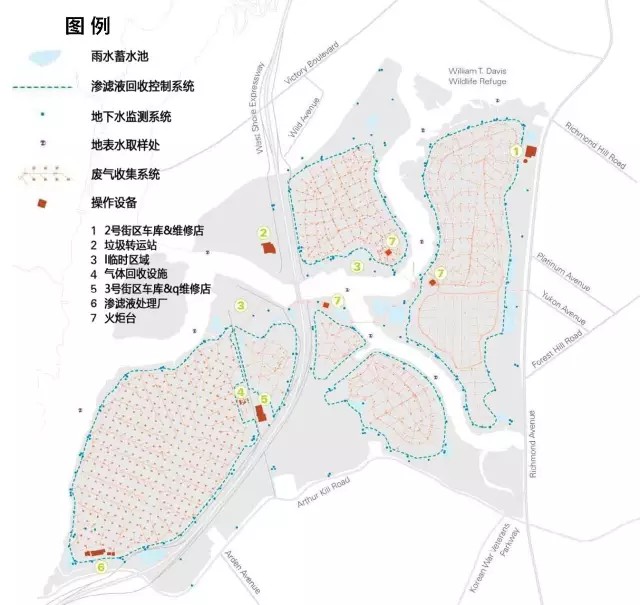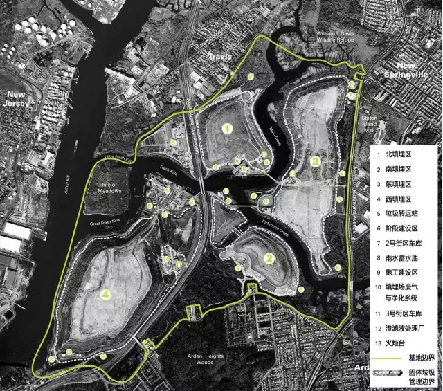 弗萊士河垃圾填埋場(chǎng)位于紐約斯塔滕島(圖3),占地面積超過(guò)2200英畝(約8.9k㎡),于1948年投入運(yùn)營(yíng),2001年停止接收垃圾。這里曾經(jīng)是世界上最大的垃圾填埋場(chǎng),也是1990年代紐約市唯一仍在使用的填埋場(chǎng)。隨著1999年弗萊士河更新計(jì)劃的啟動(dòng),原有填埋場(chǎng)區(qū)陸續(xù)關(guān)閉并封場(chǎng),直至2001年,填埋場(chǎng)接收了最后一批垃圾——“9?11”事件的世貿(mào)中心建筑廢墟。