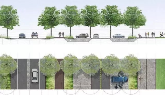 盡管公共交通是公園所在的斯塔滕島鼓勵(lì)發(fā)展的交通方式,但在以小汽車(chē)為主導(dǎo)的美國(guó)城市,短時(shí)間內(nèi)轉(zhuǎn)變主要交通方式的可行性較低。因此,公園規(guī)劃包含了適應(yīng)自然環(huán)境的停車(chē)設(shè)施規(guī)劃(圖9)。停車(chē)場(chǎng)分散于公園內(nèi)的各個(gè)主要片區(qū),掩映在線性栽植的樹(shù)蔭下,并與停車(chē)場(chǎng)周?chē)淖匀画h(huán)境相融合。停車(chē)場(chǎng)以可滲透性材料鋪設(shè),以減低熱島效應(yīng),并控制地表徑流(圖10)。
