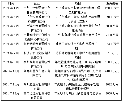 動(dòng)力電池回收市場(chǎng)廣闊,各個(gè)企業(yè)蓄勢(shì)待發(fā)。2015年是新能源汽車銷售元年,從那時(shí)起,新能源汽車的銷量不斷上漲,相應(yīng)的,裝在新能源汽車上的動(dòng)力電池,經(jīng)過4-5年的使用,也迎來了退役時(shí)刻。根據(jù)數(shù)據(jù)顯示,2020年我國動(dòng)力電池累計(jì)退役量約20萬噸,2025年累計(jì)退役量將達(dá)78萬噸。面對(duì)不斷增長(zhǎng)的廢舊電池退役量,行業(yè)內(nèi)企業(yè)紛紛投資擴(kuò)大回收產(chǎn)能。據(jù)不完全統(tǒng)計(jì),2021年規(guī)模以上的電池回收投資及擴(kuò)建項(xiàng)目有10余項(xiàng),其投資總規(guī)模接近13.5億元。